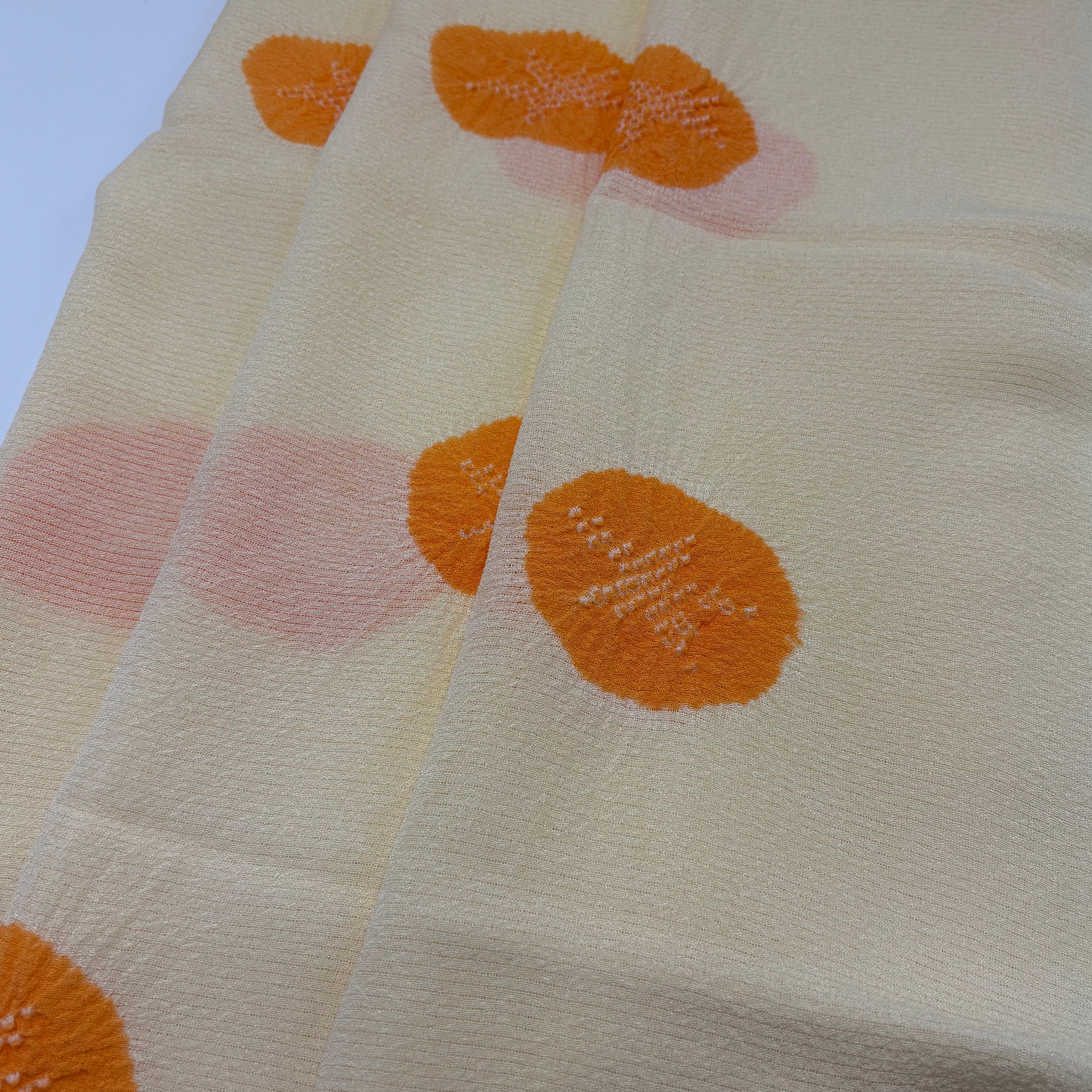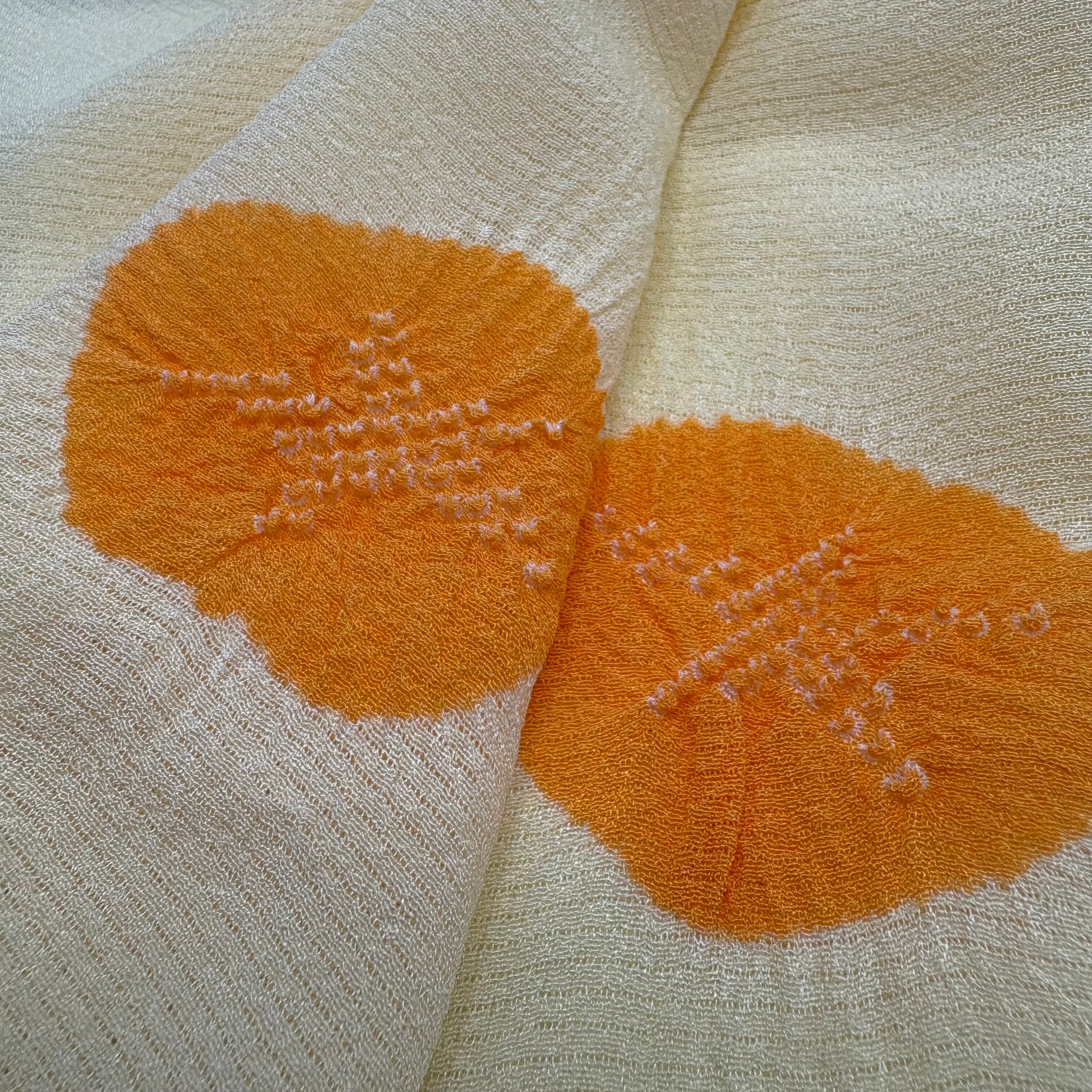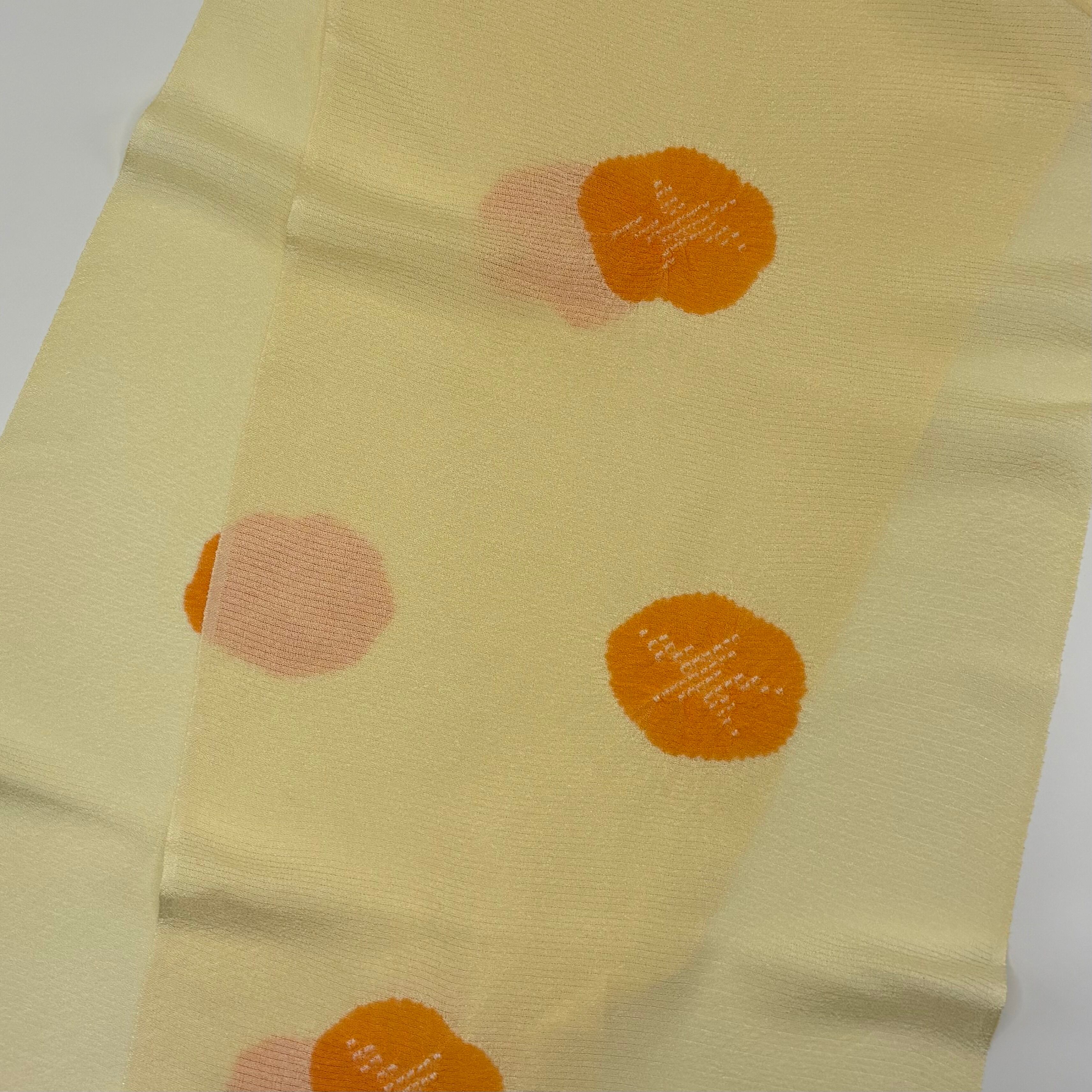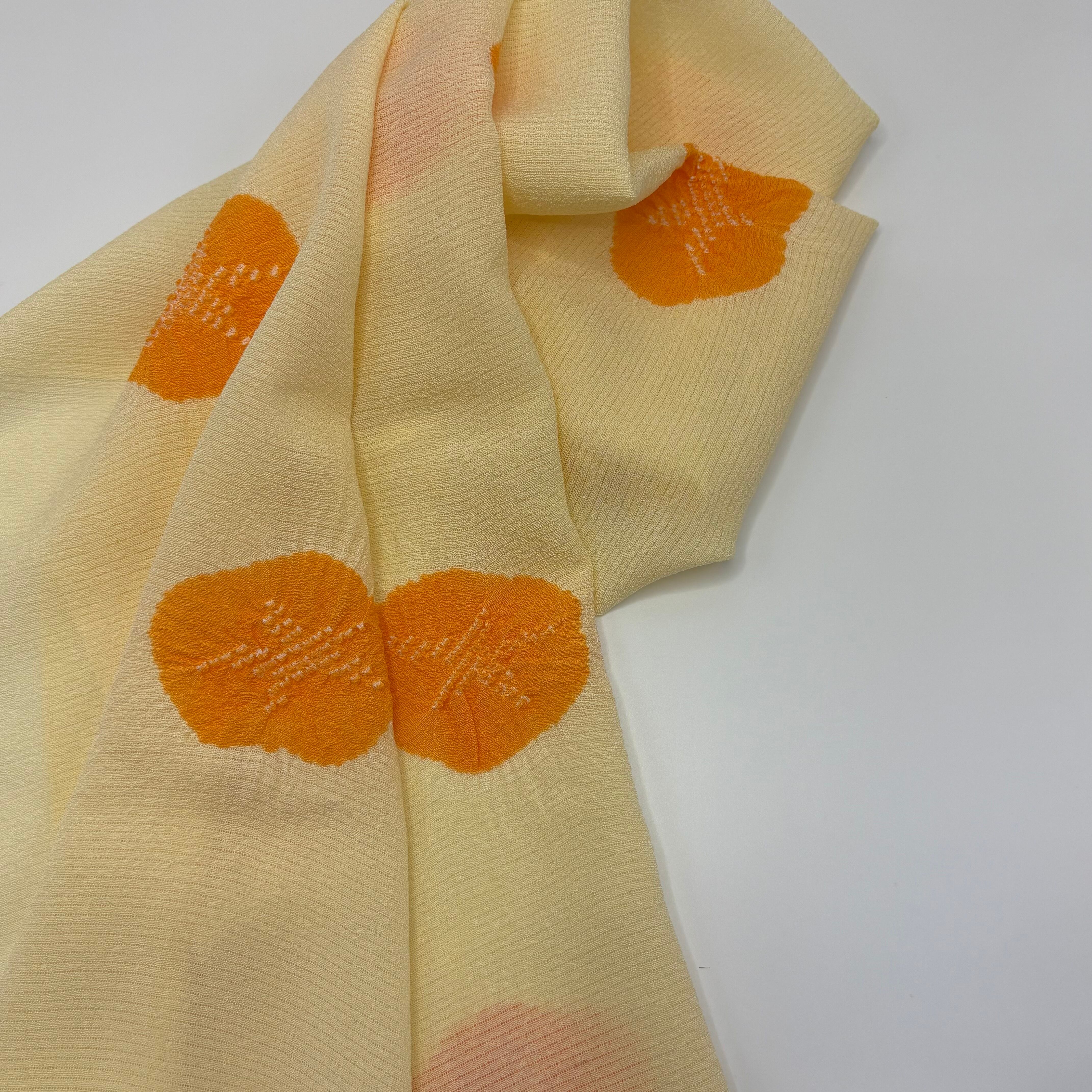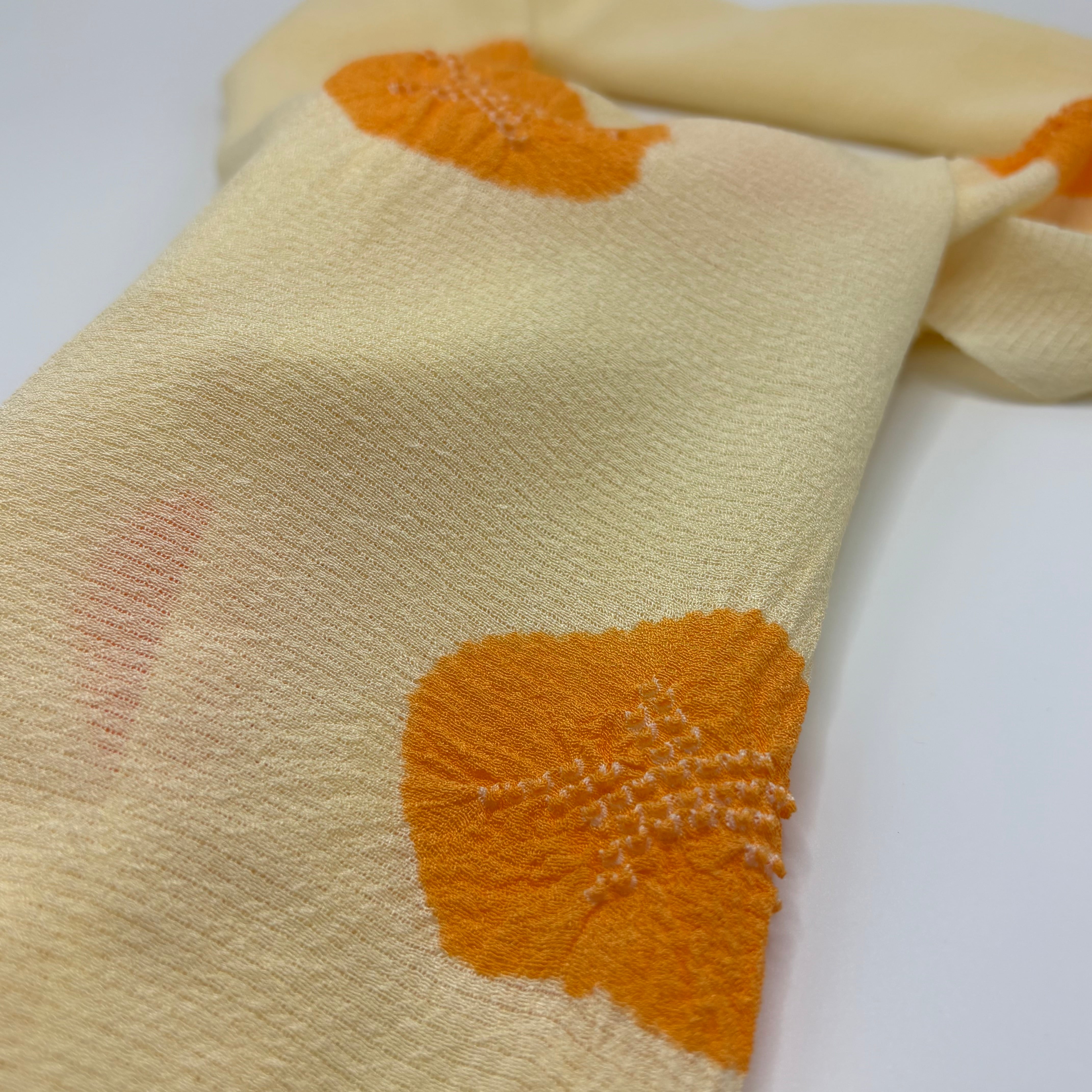 やさしいクリーム色の絽地に、朱色の絞りで朝顔をあしらった、夏らしい帯揚げです。