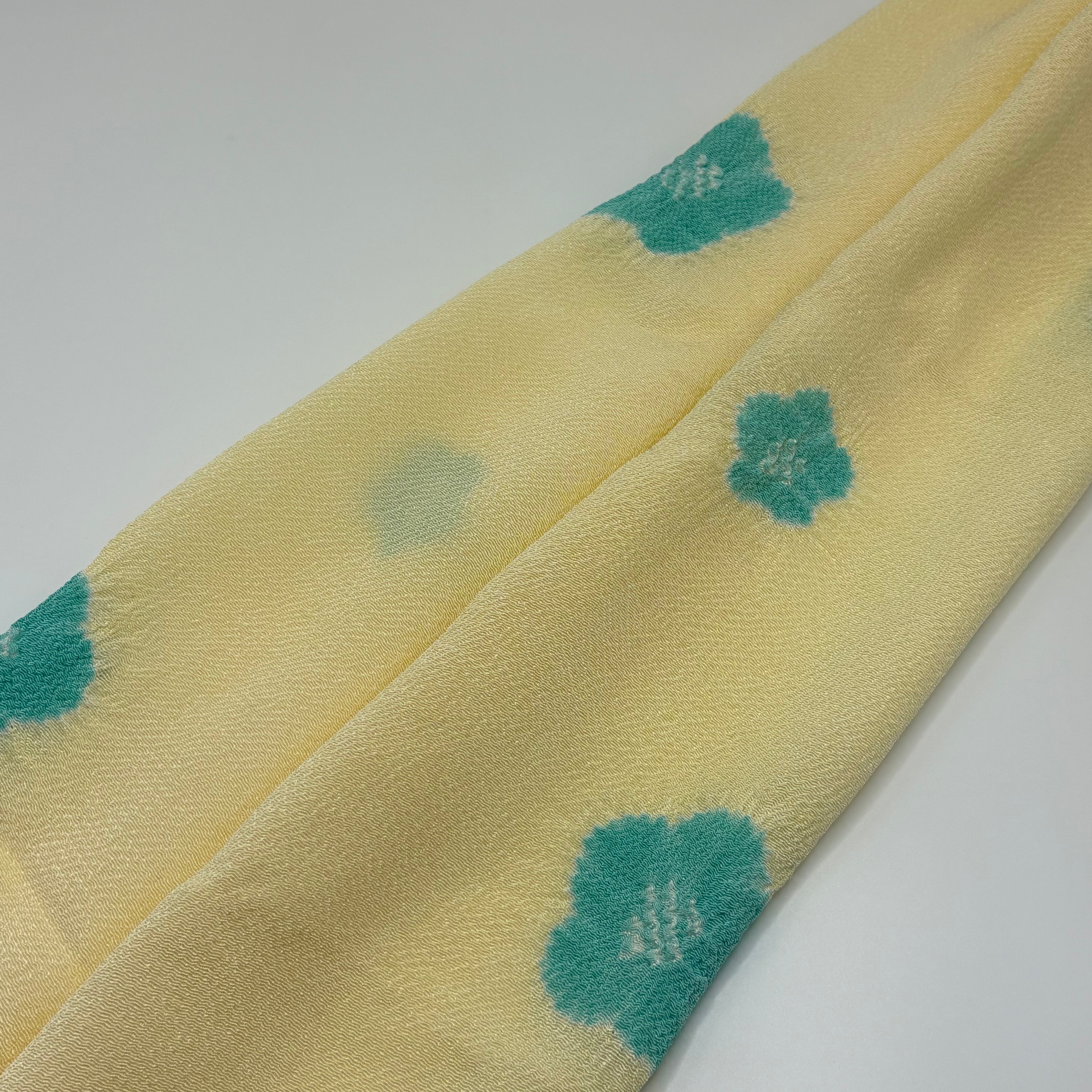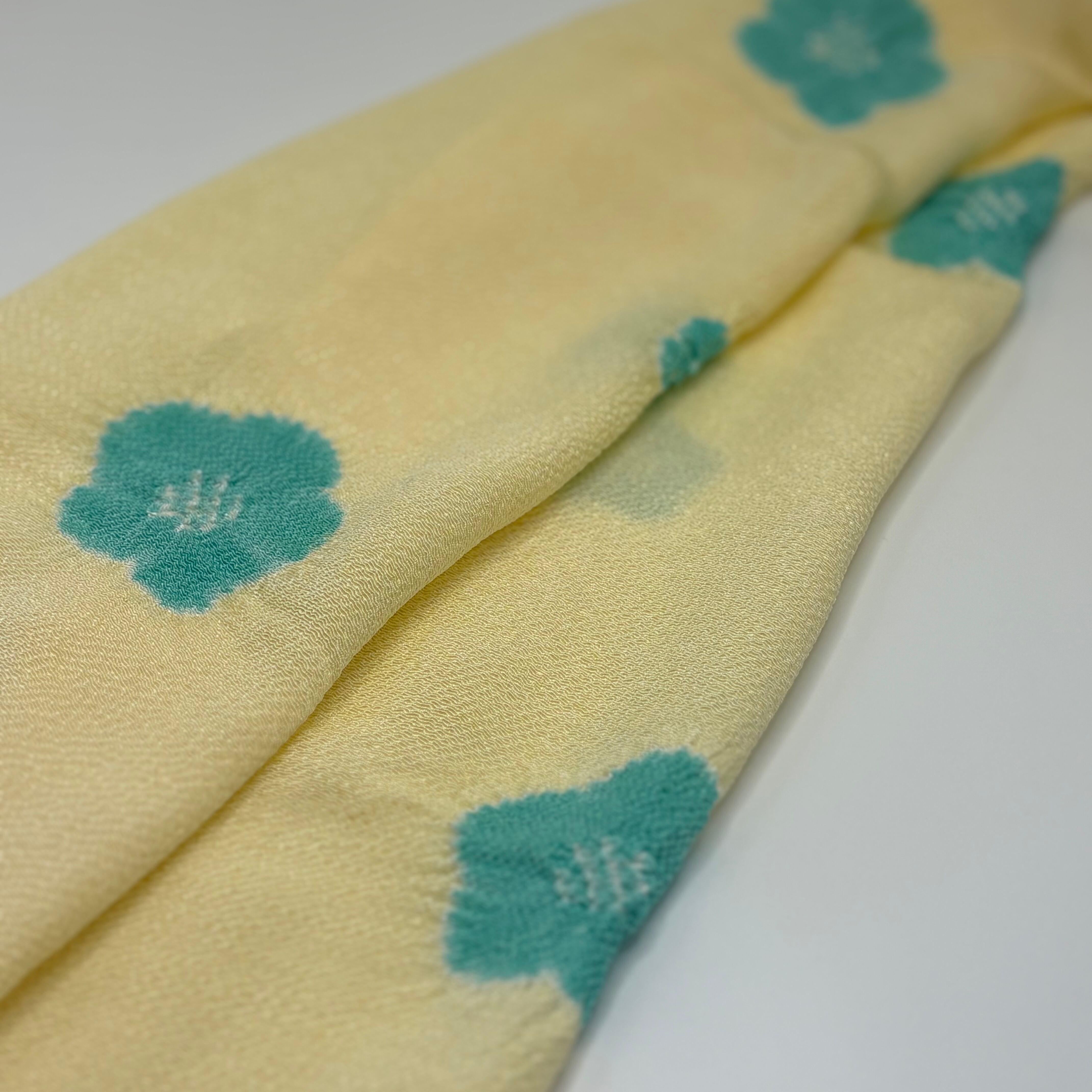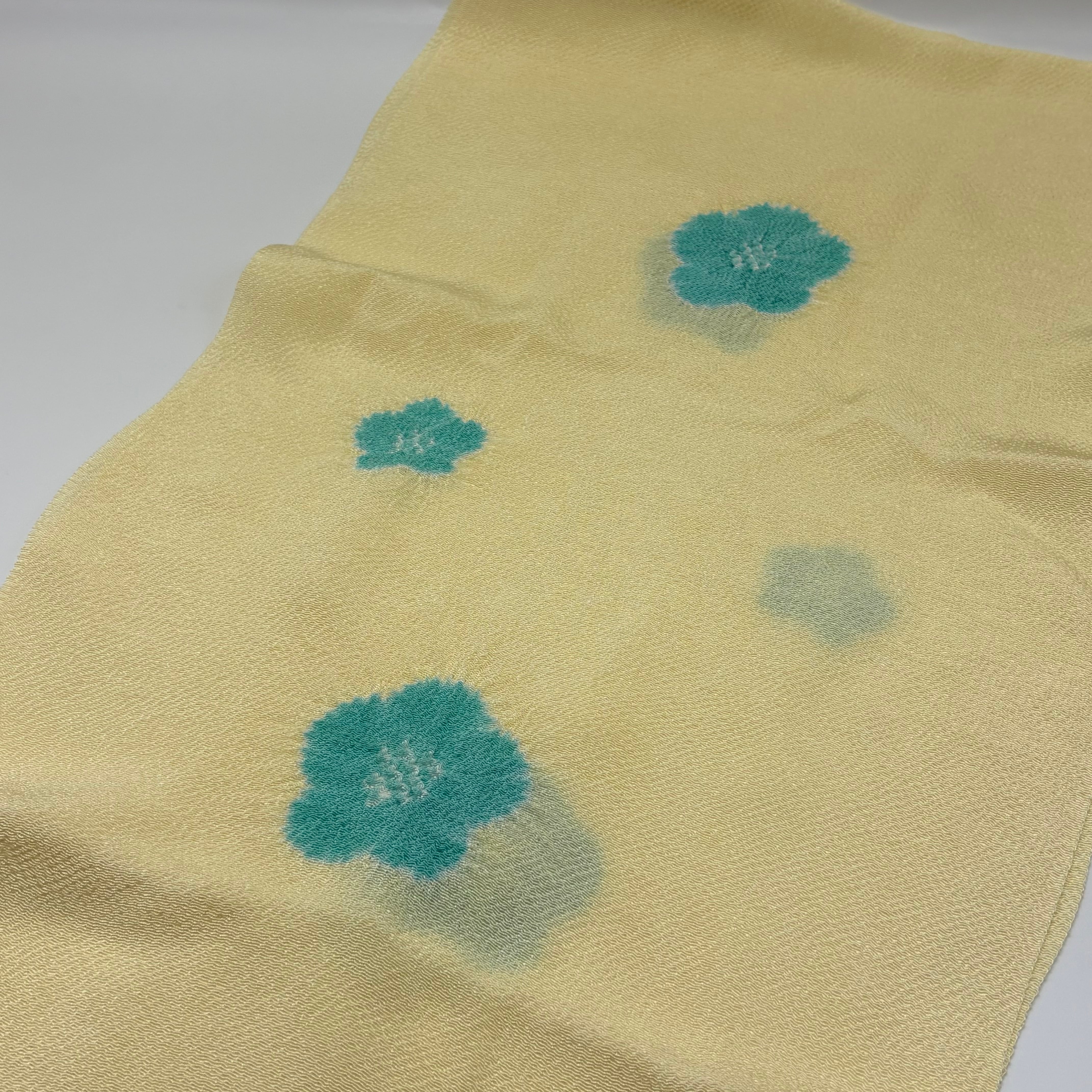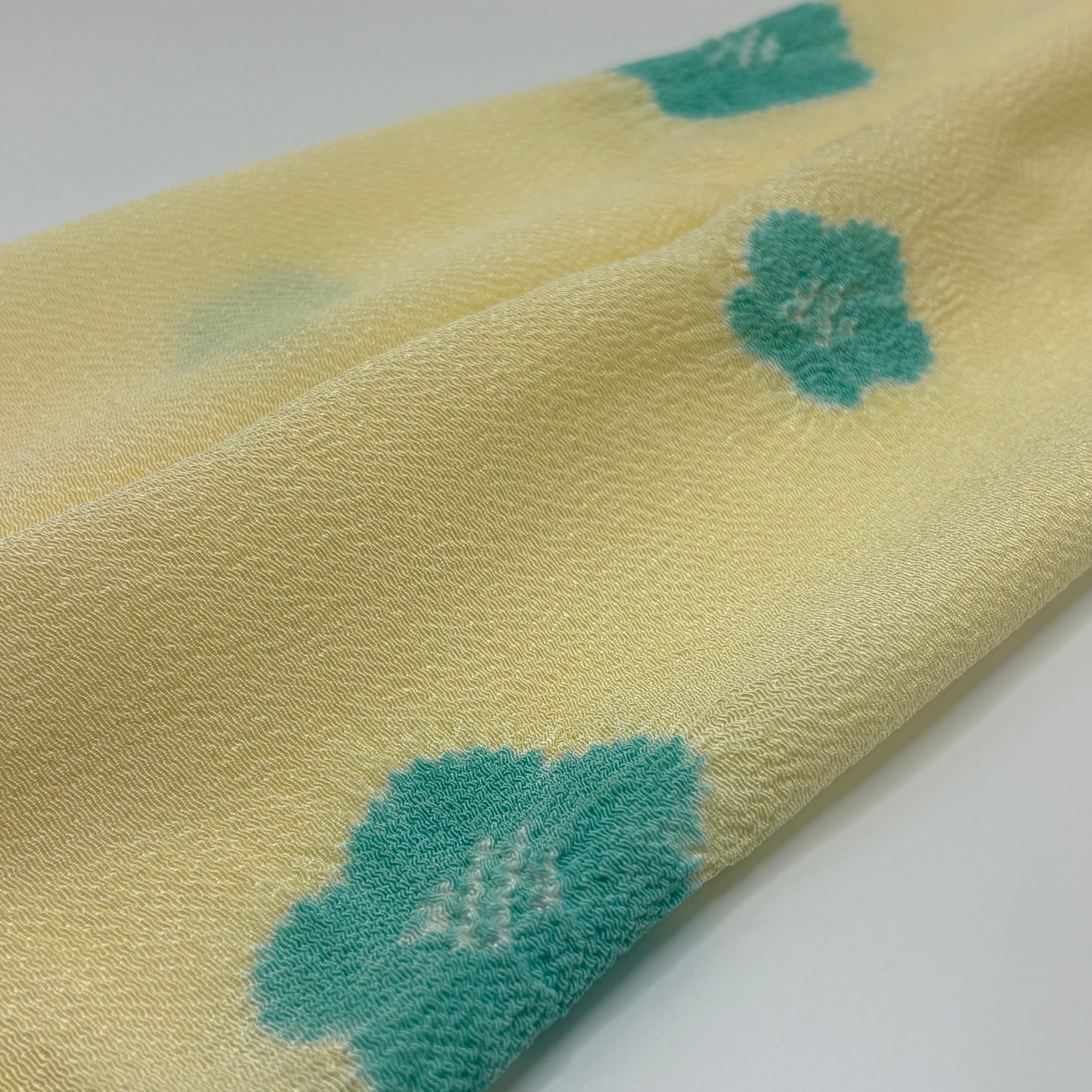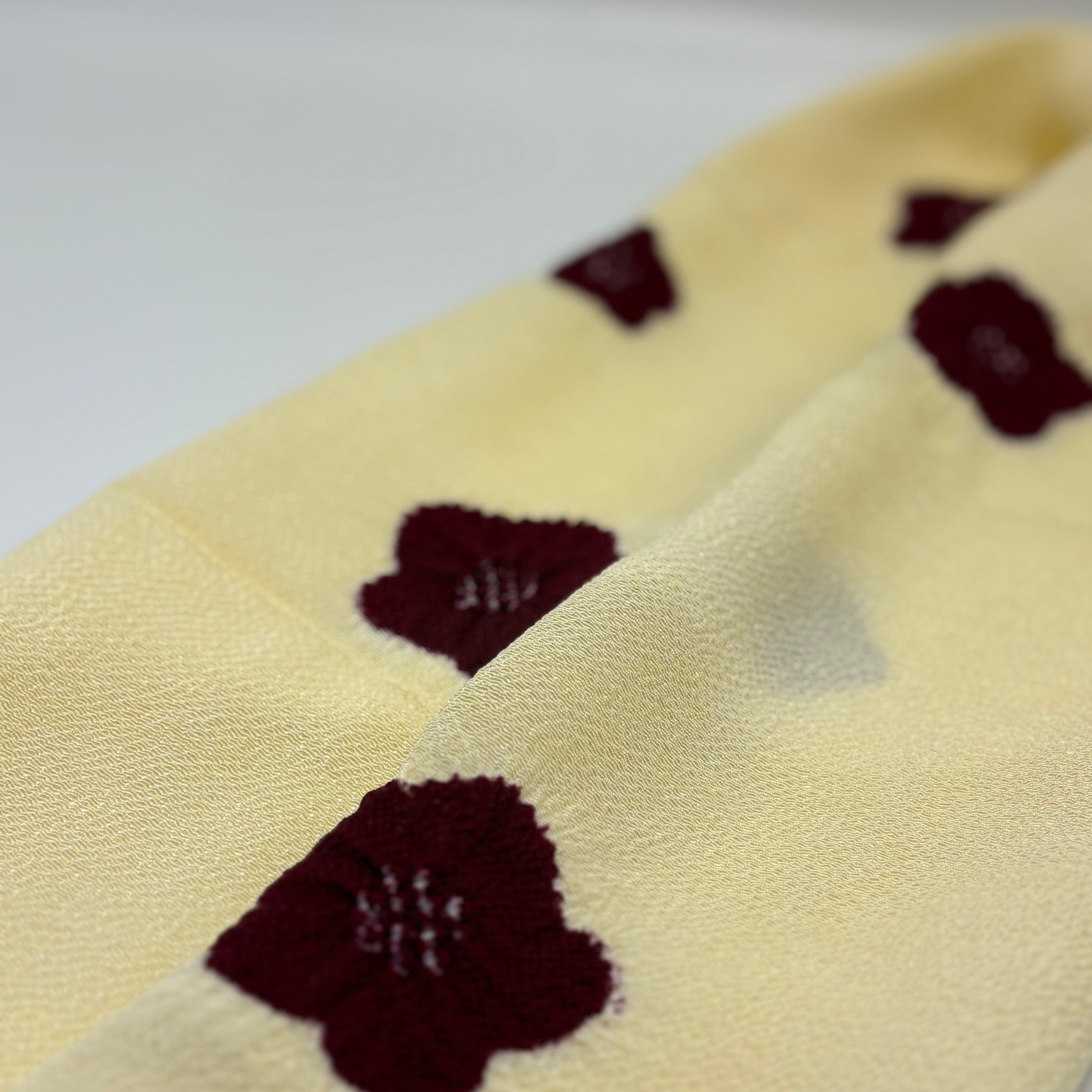淡くやさしいクリーム色の地に、五弁の花を絞りで散らした、上品で愛らしい帯揚げです。