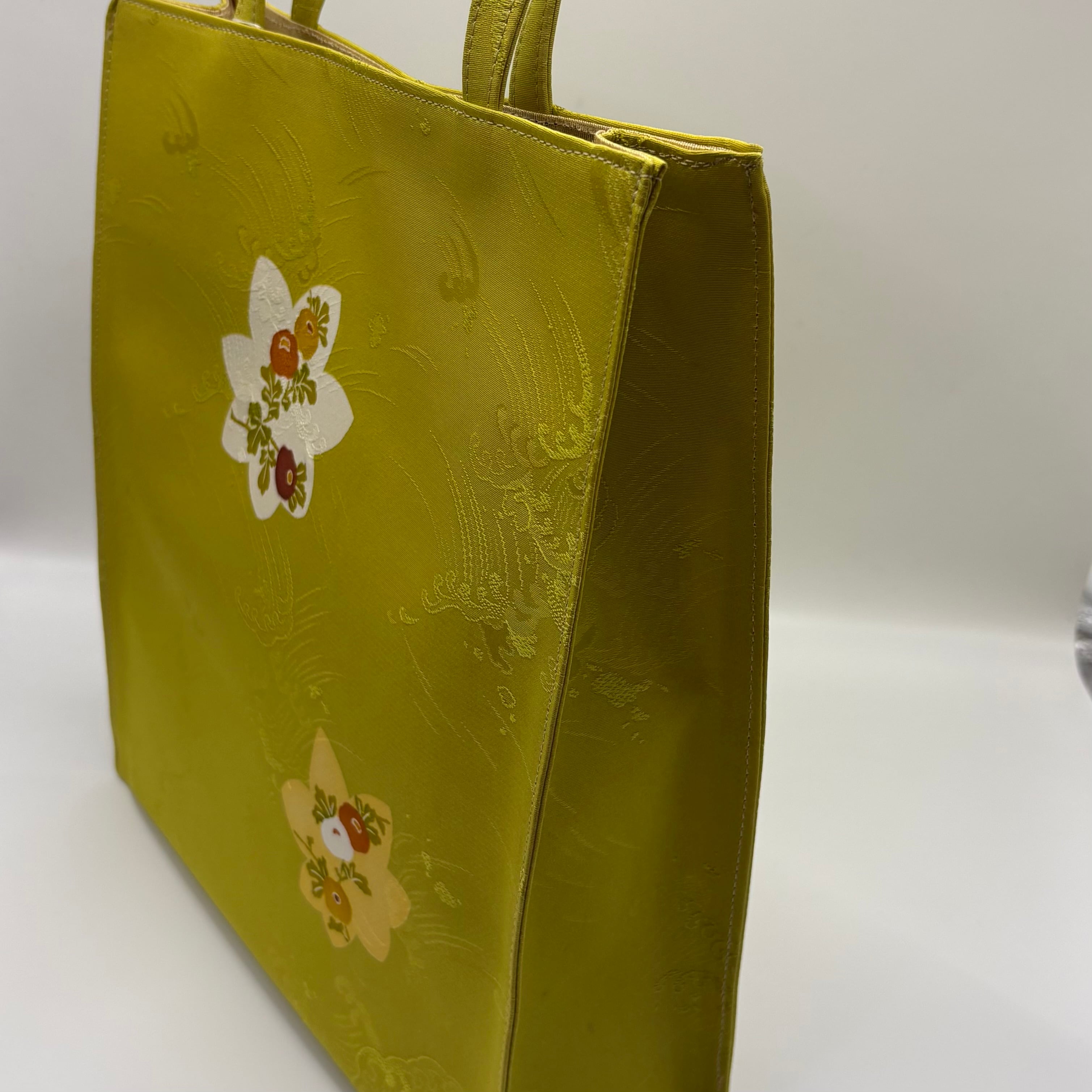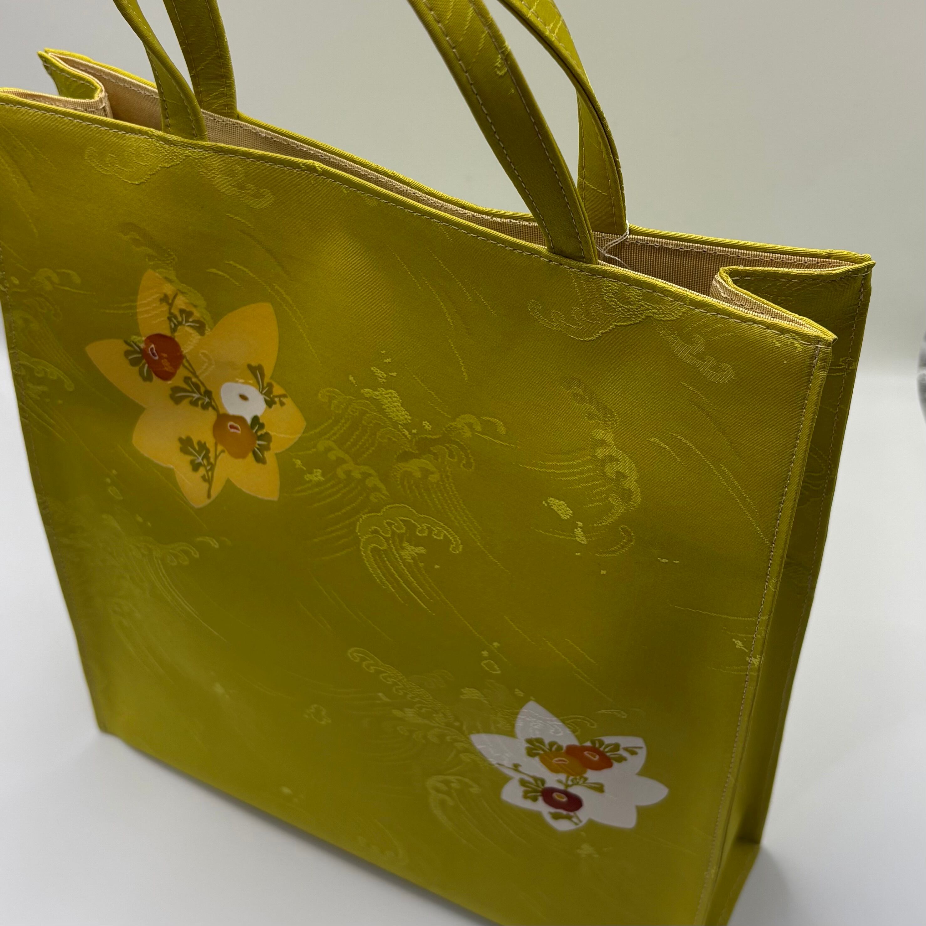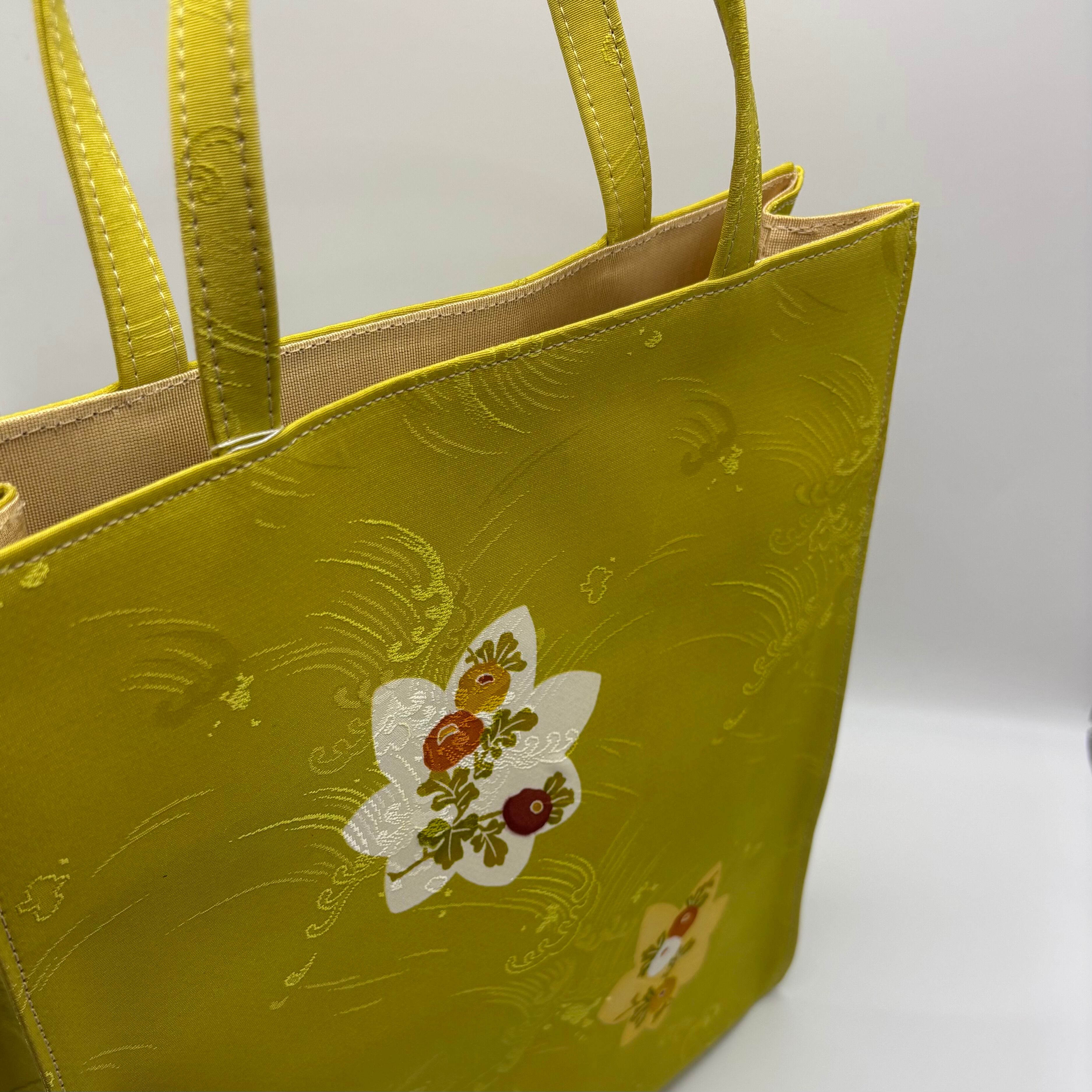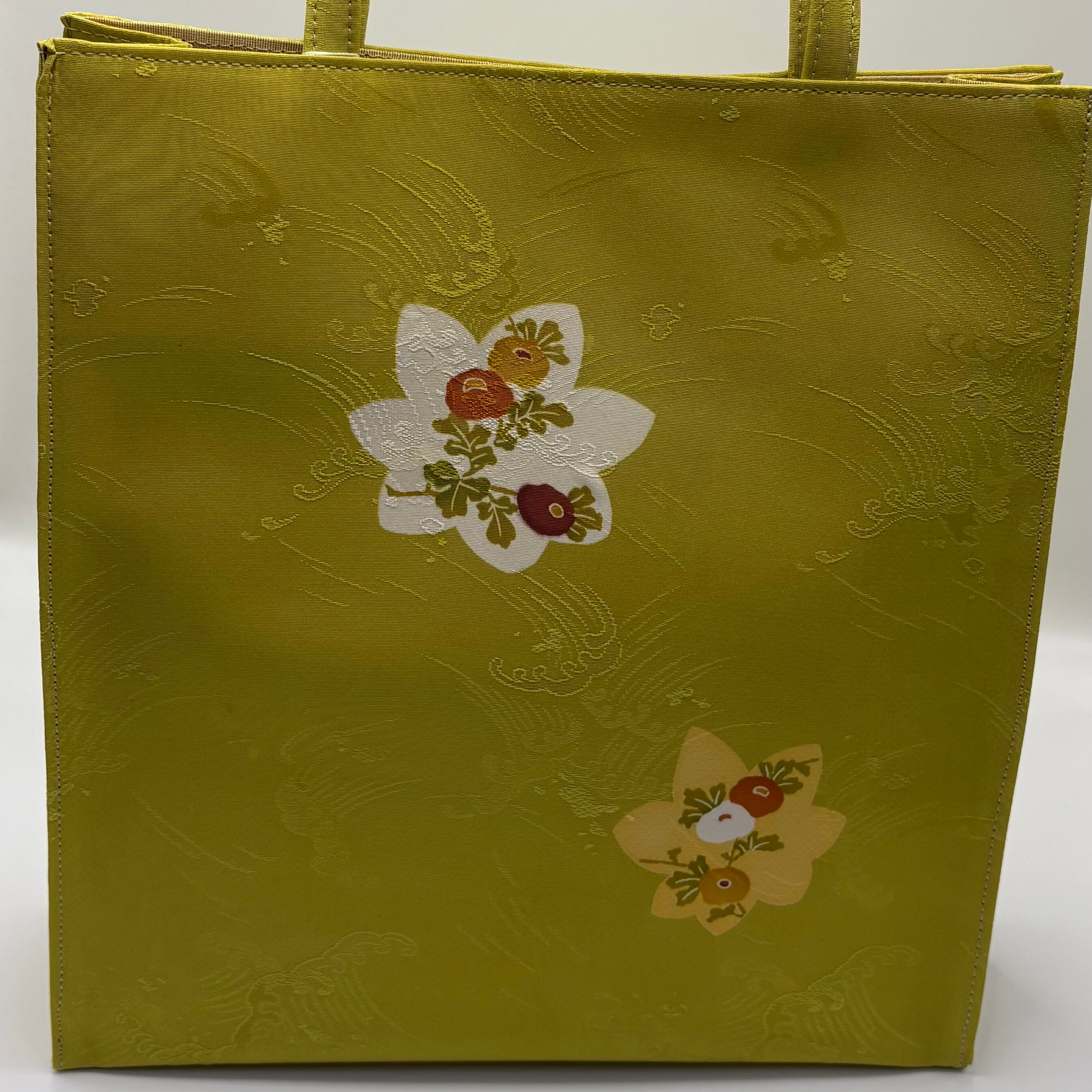 小紋の生地を使用したトートバック。地色のひわ色と楓と万寿菊のお柄が志ま亀らしく可愛らしさもありつつ、落ち着いた雰囲気もあります。生地の地紋は波柄でニュアンスのあるおしゃれなバックです。