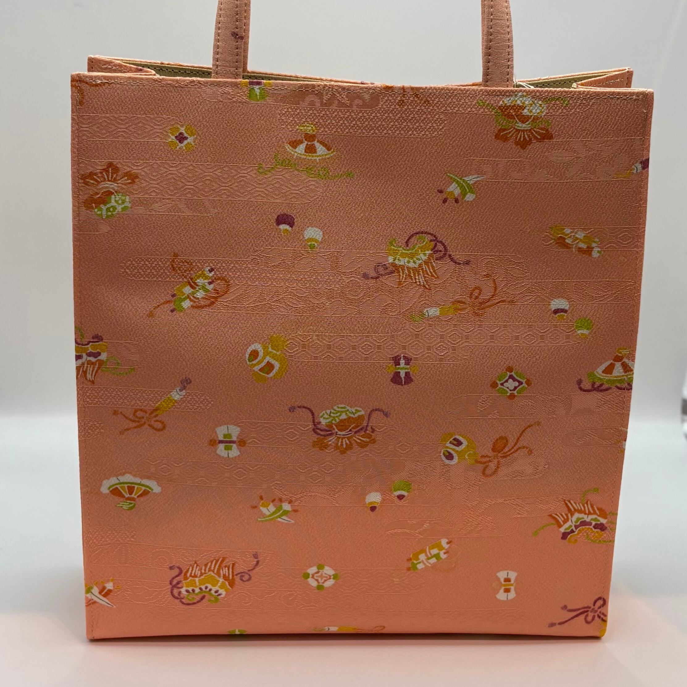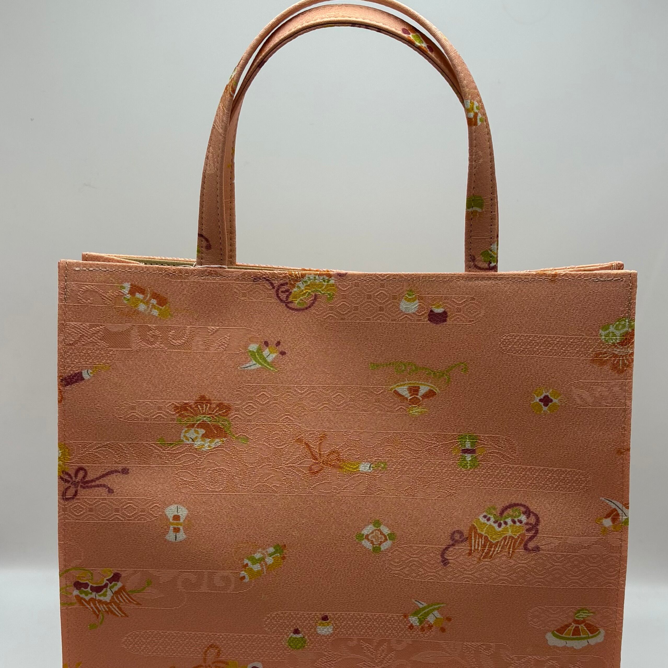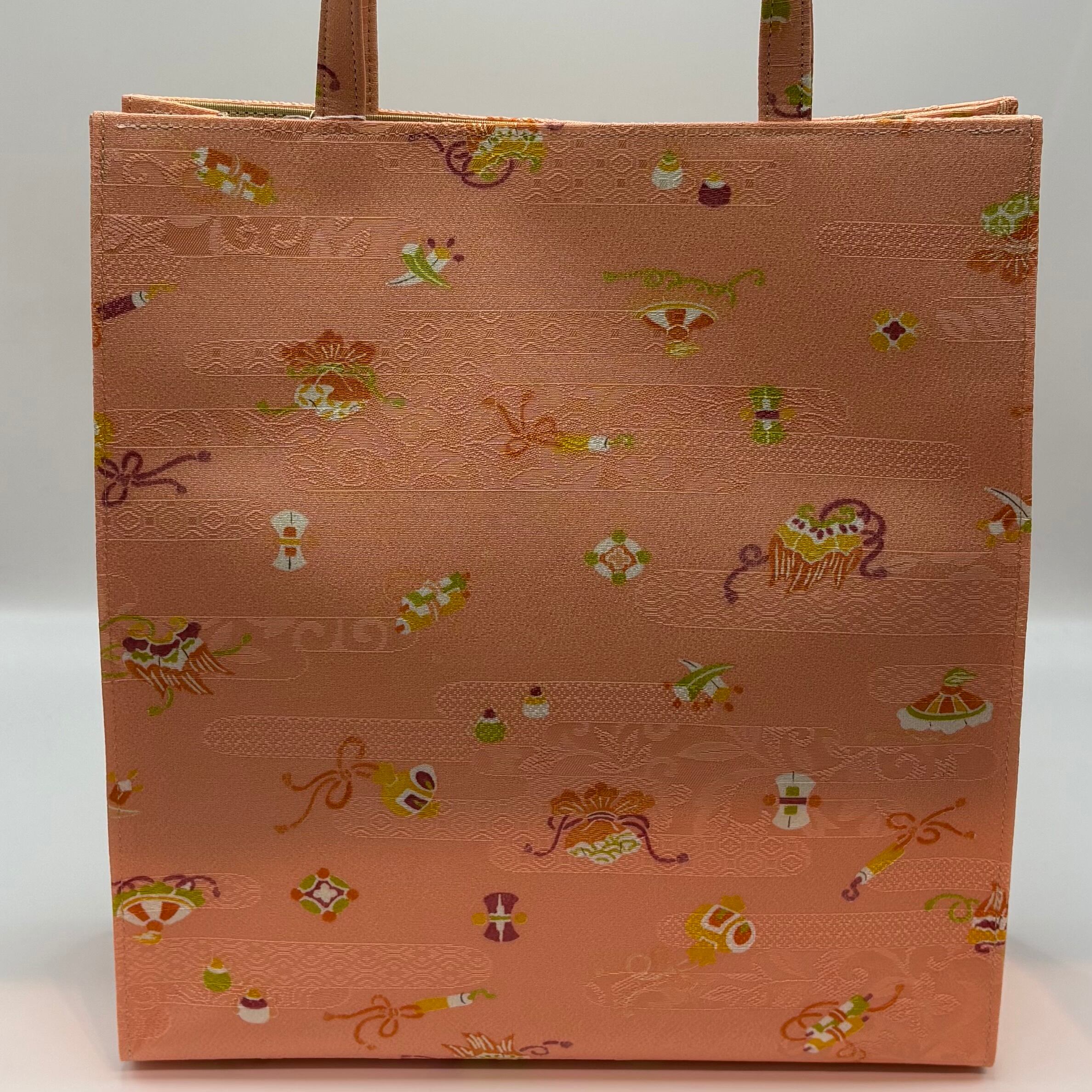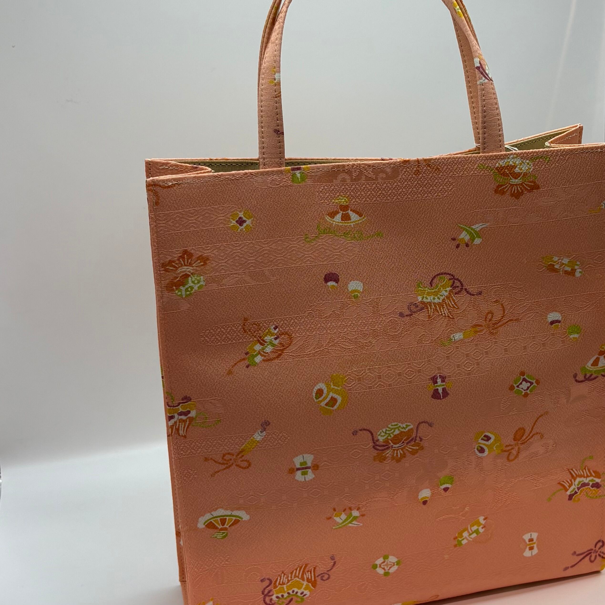 小紋の生地を使用したトートバック。可愛らしい桃色の地紋入りの生地に宝づくし模様がふんだんに施されています。挿し色にもなる華やかなバックです。