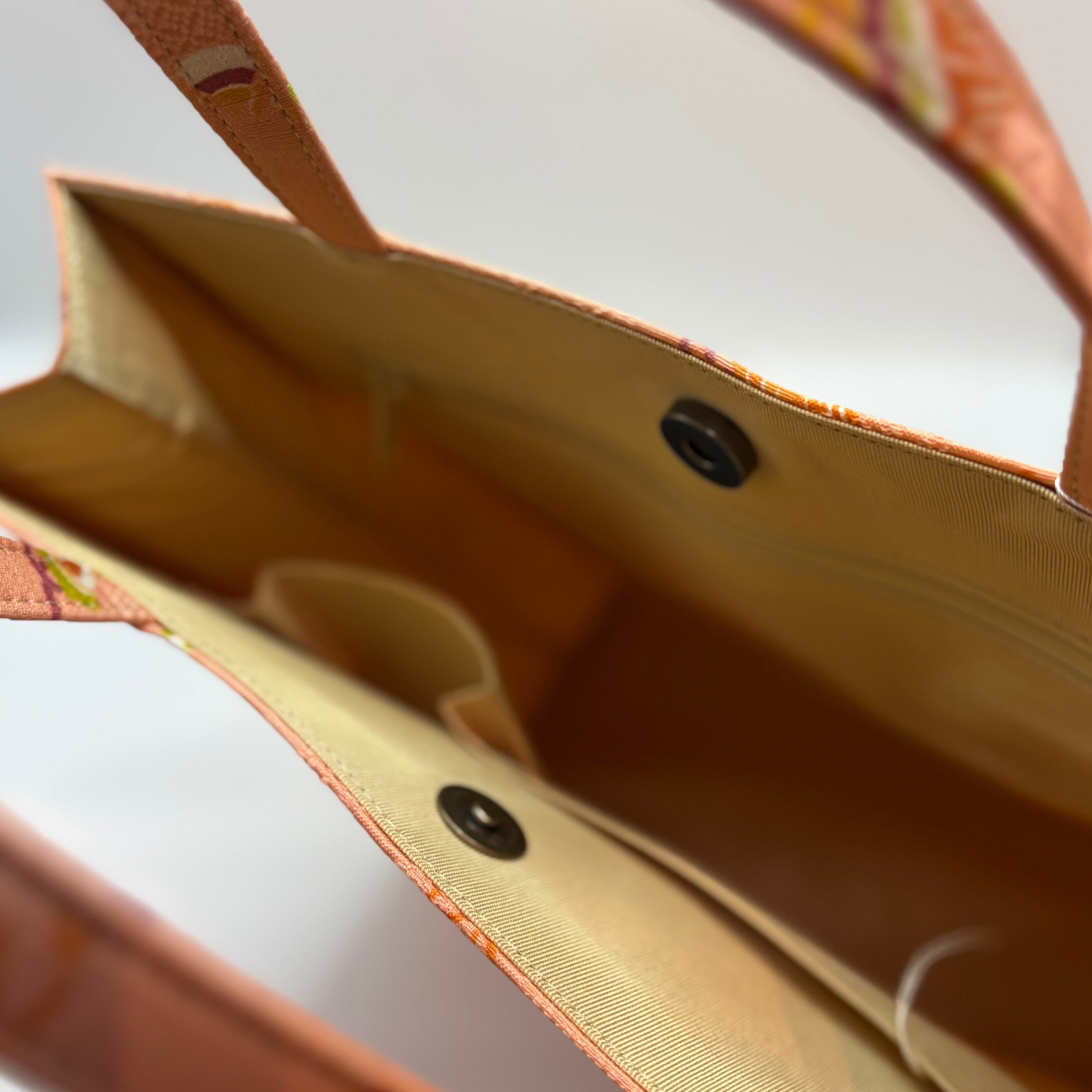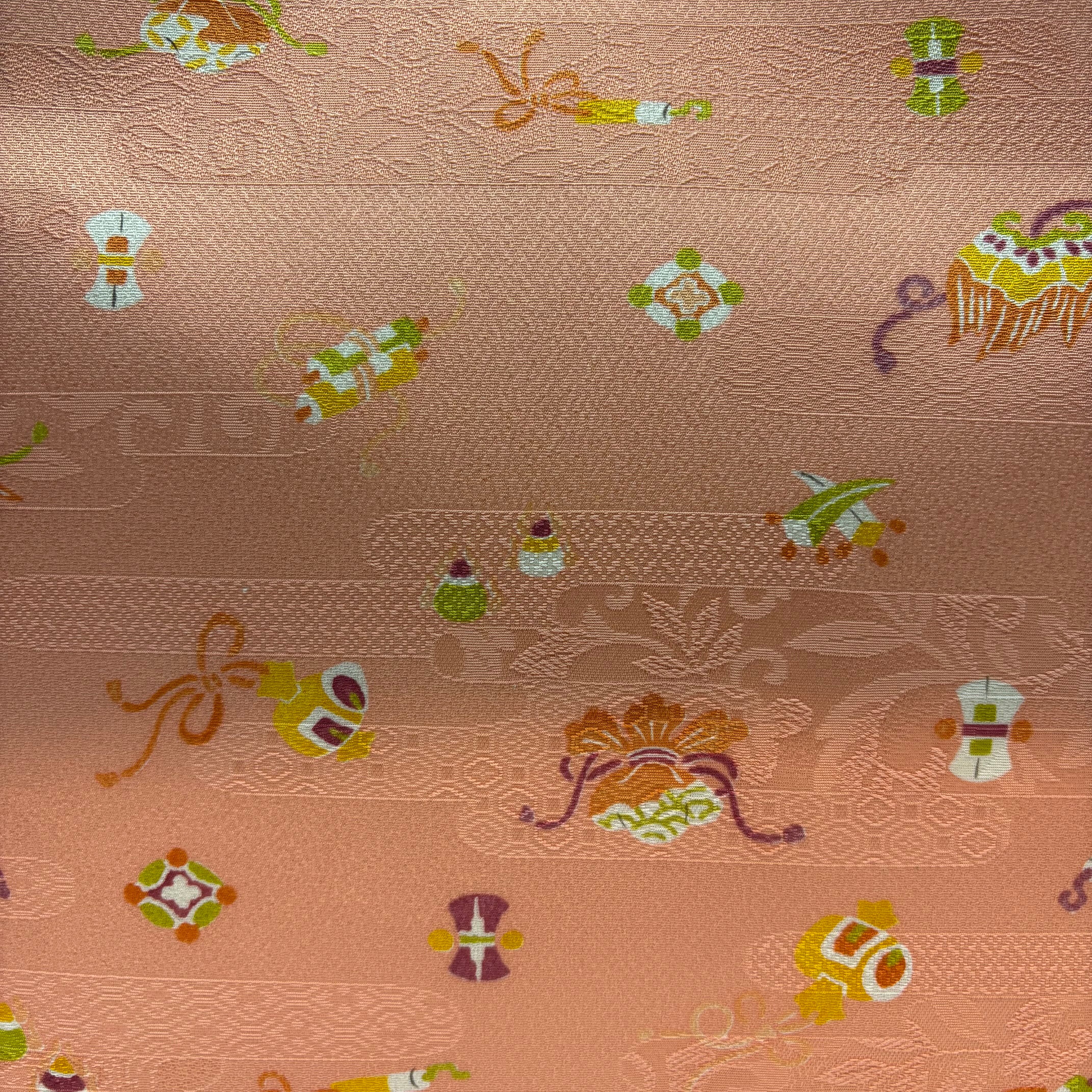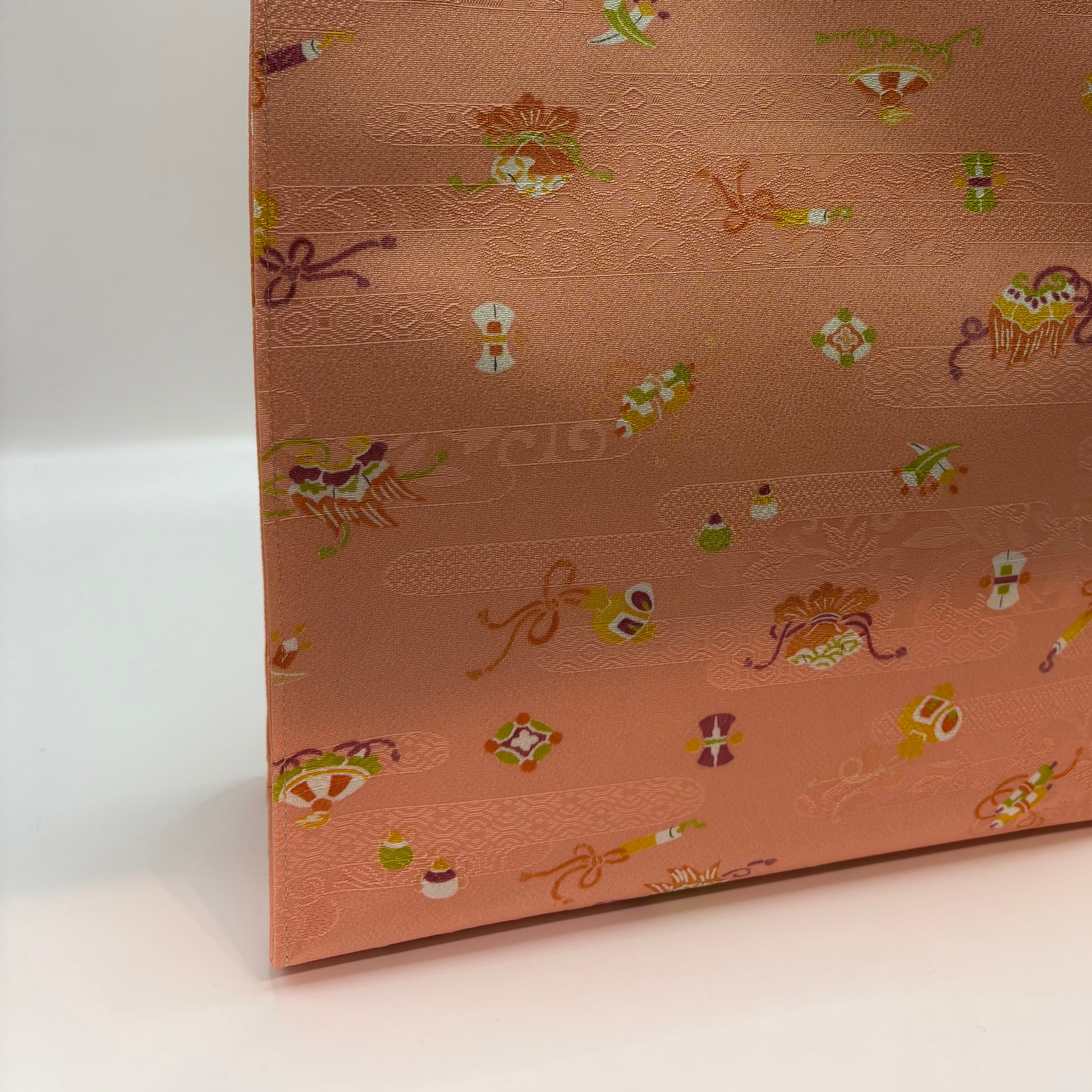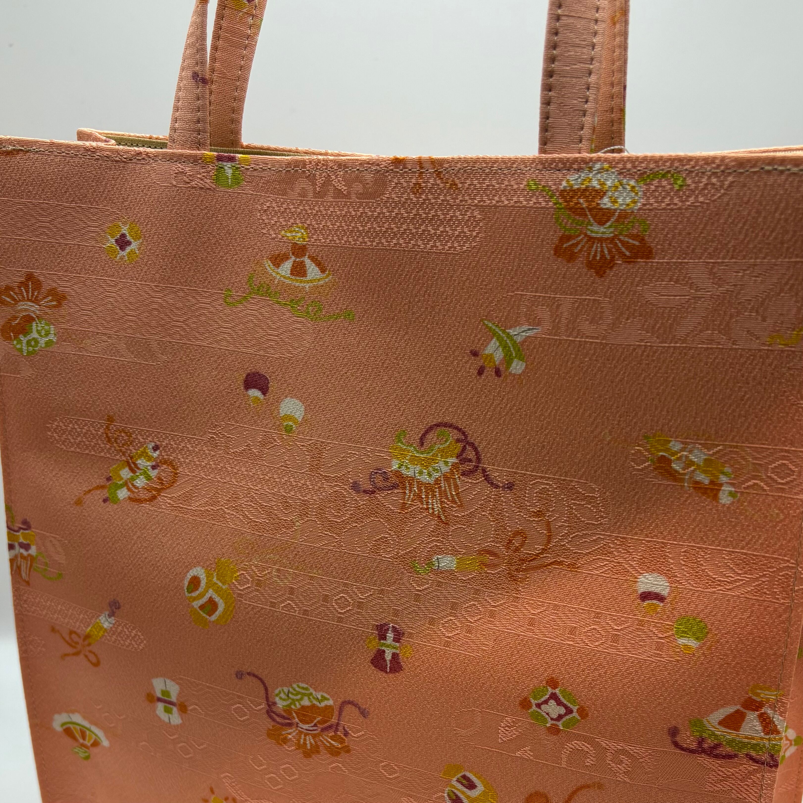 小紋の生地を使用したトートバック。可愛らしい桃色の地紋入りの生地に宝づくし模様がふんだんに施されています。挿し色にもなる華やかなバックです。