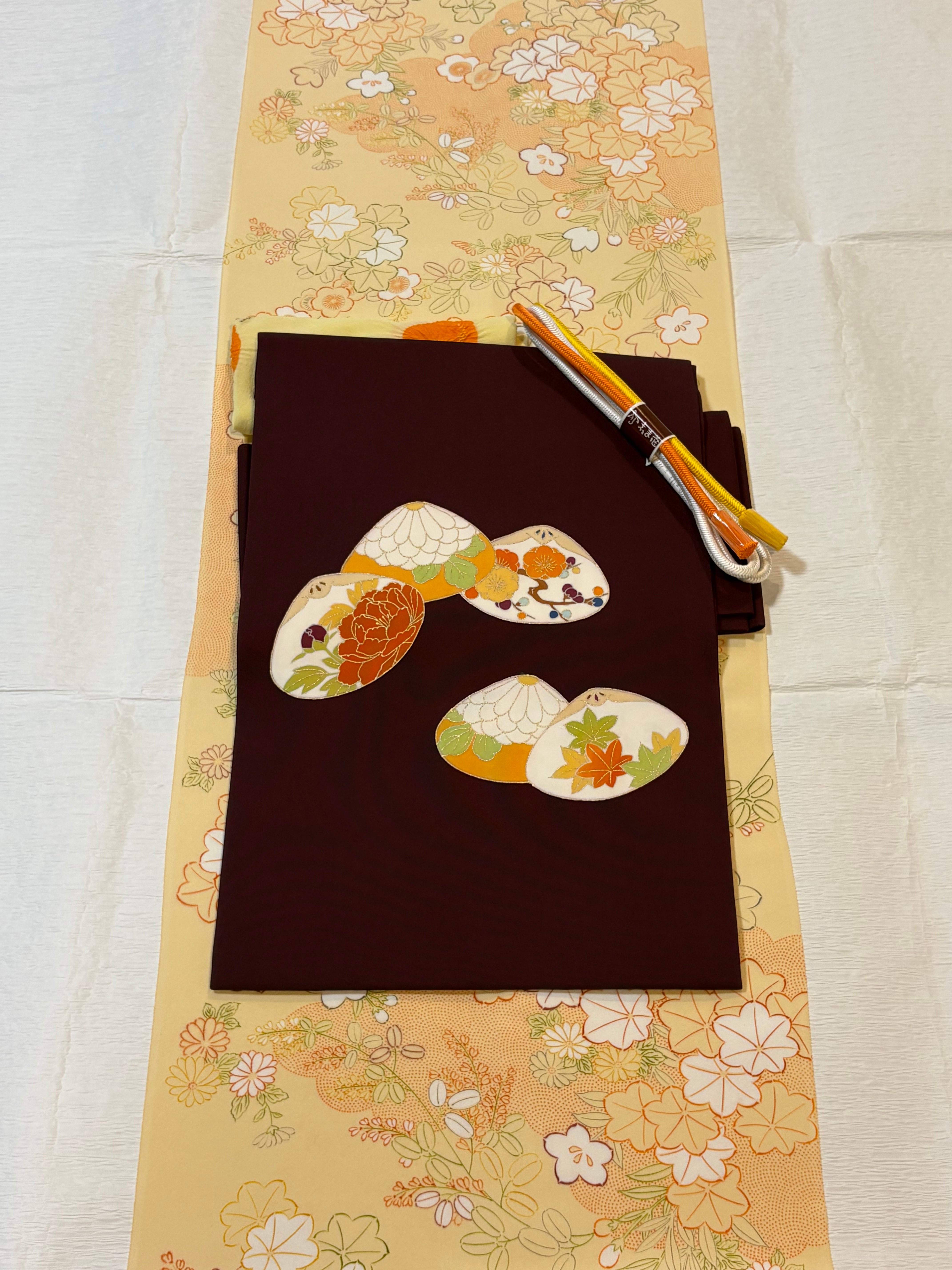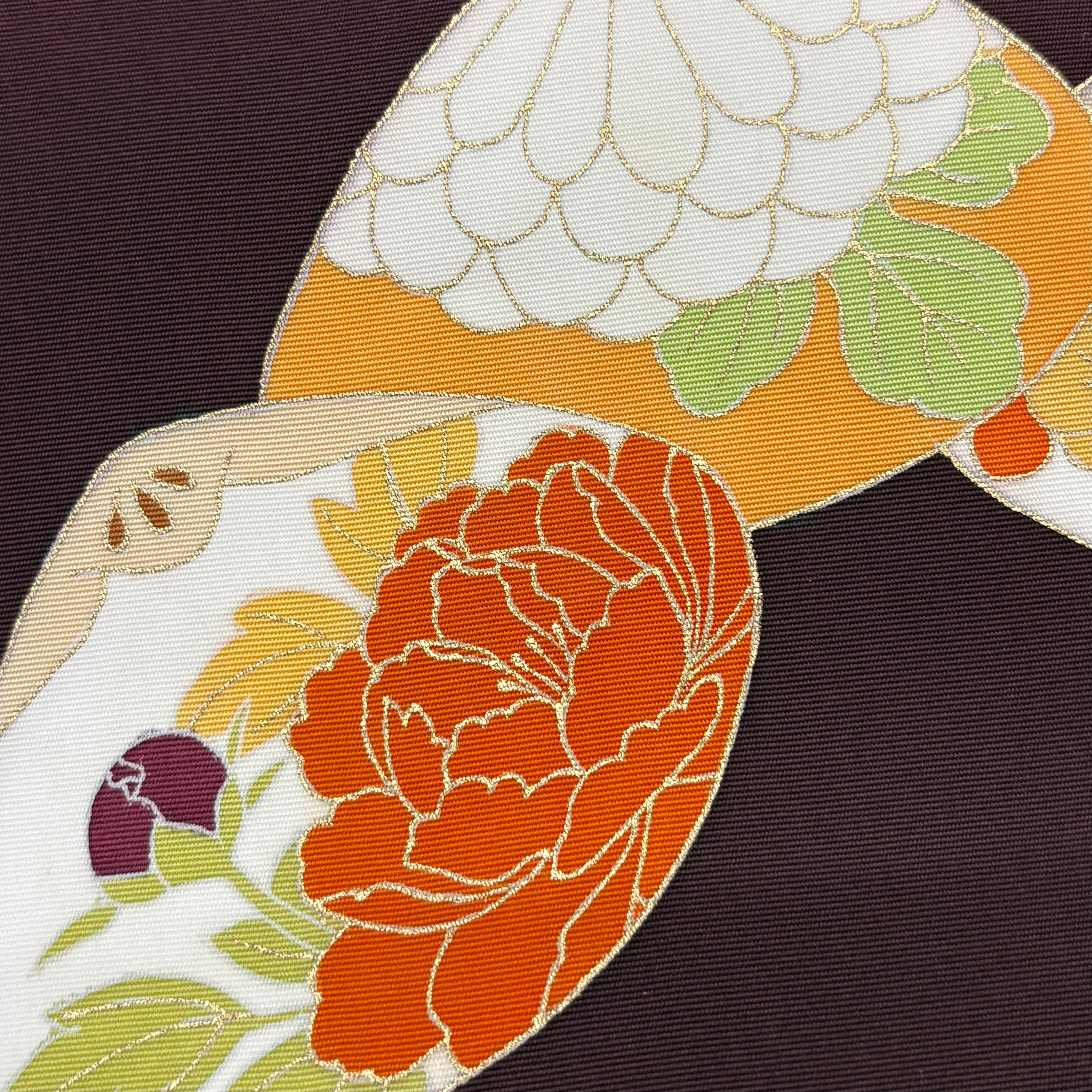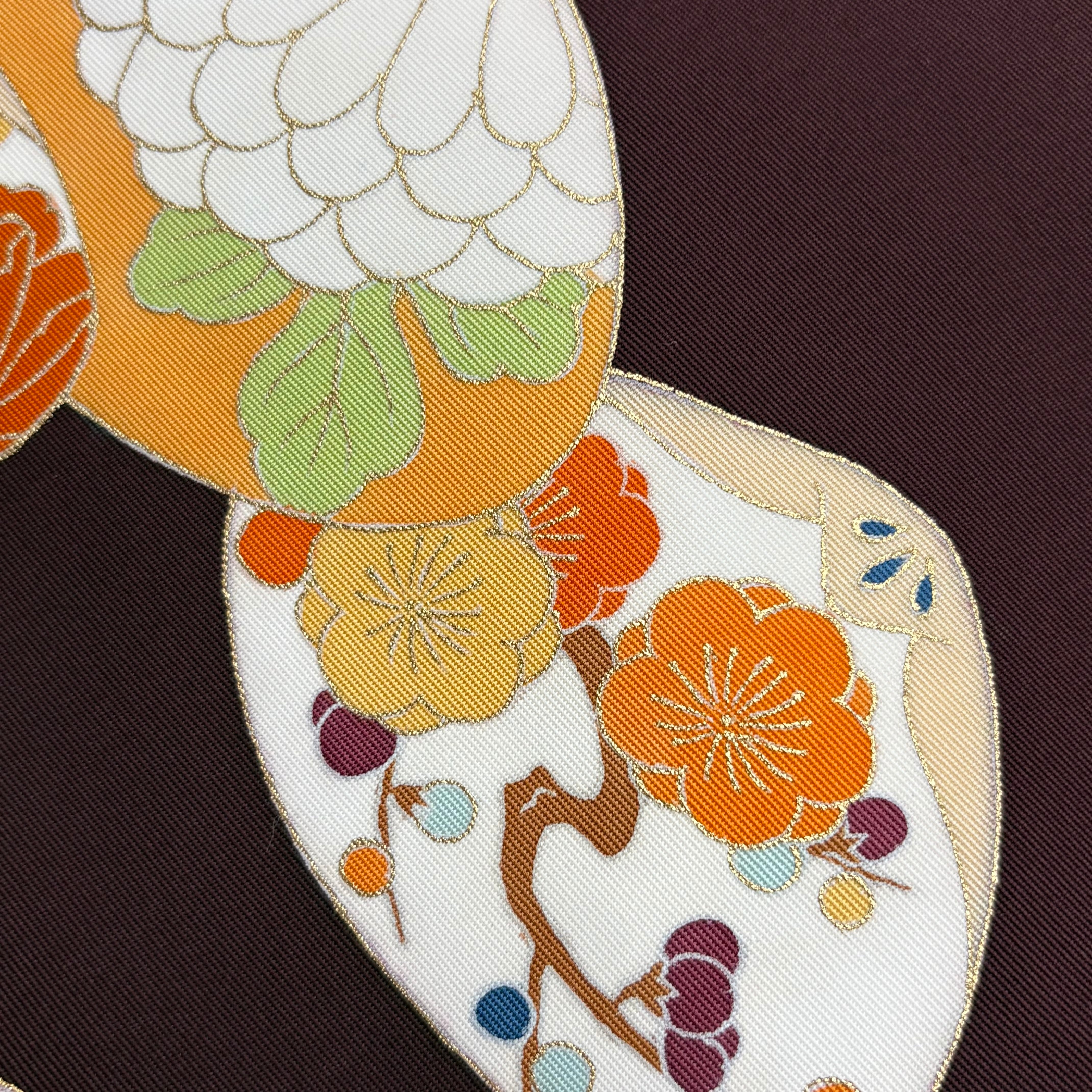 塩瀬の風合いを活かし、貝のひとつひとつに手描友禅で描かれた文様が、上品な華やぎを添えています。