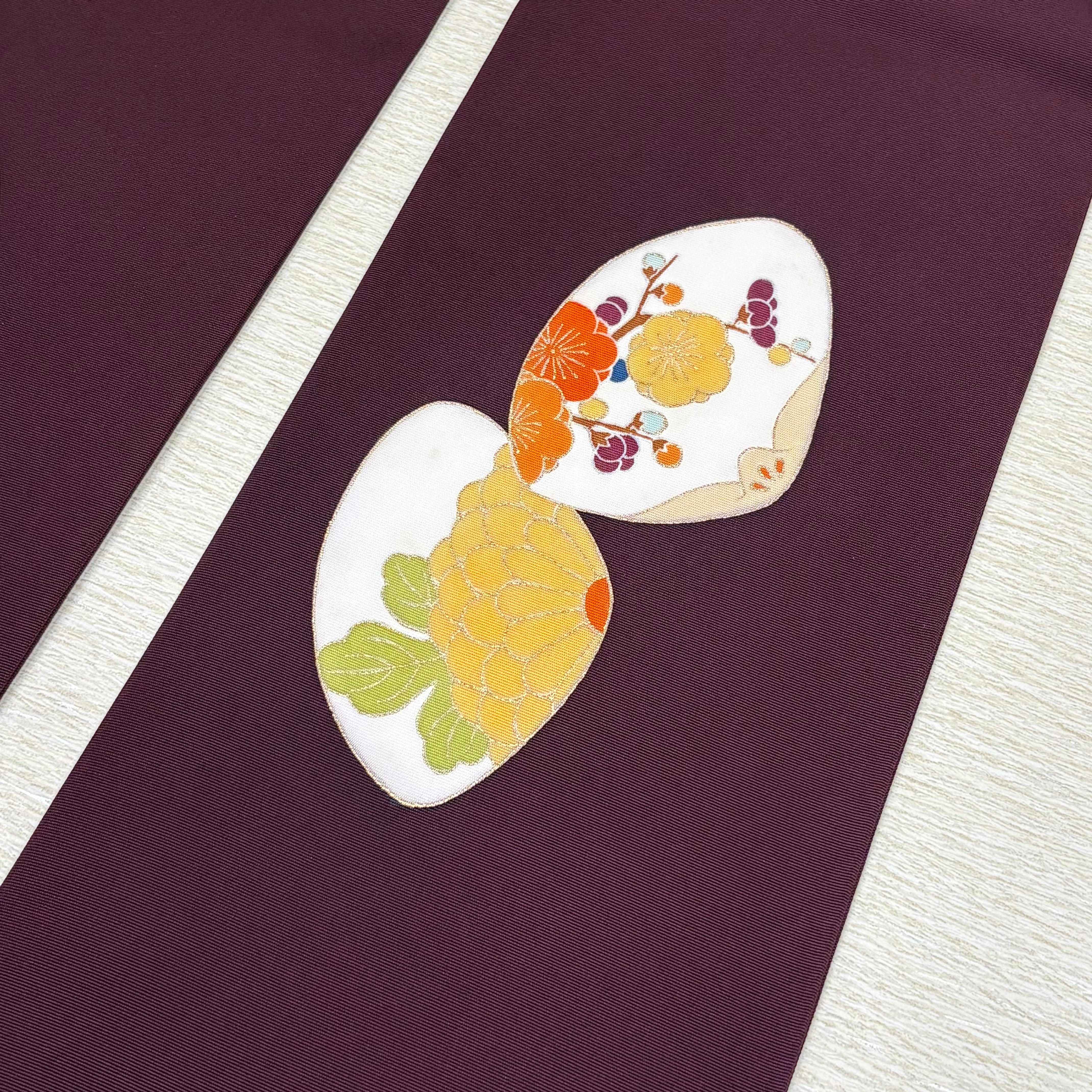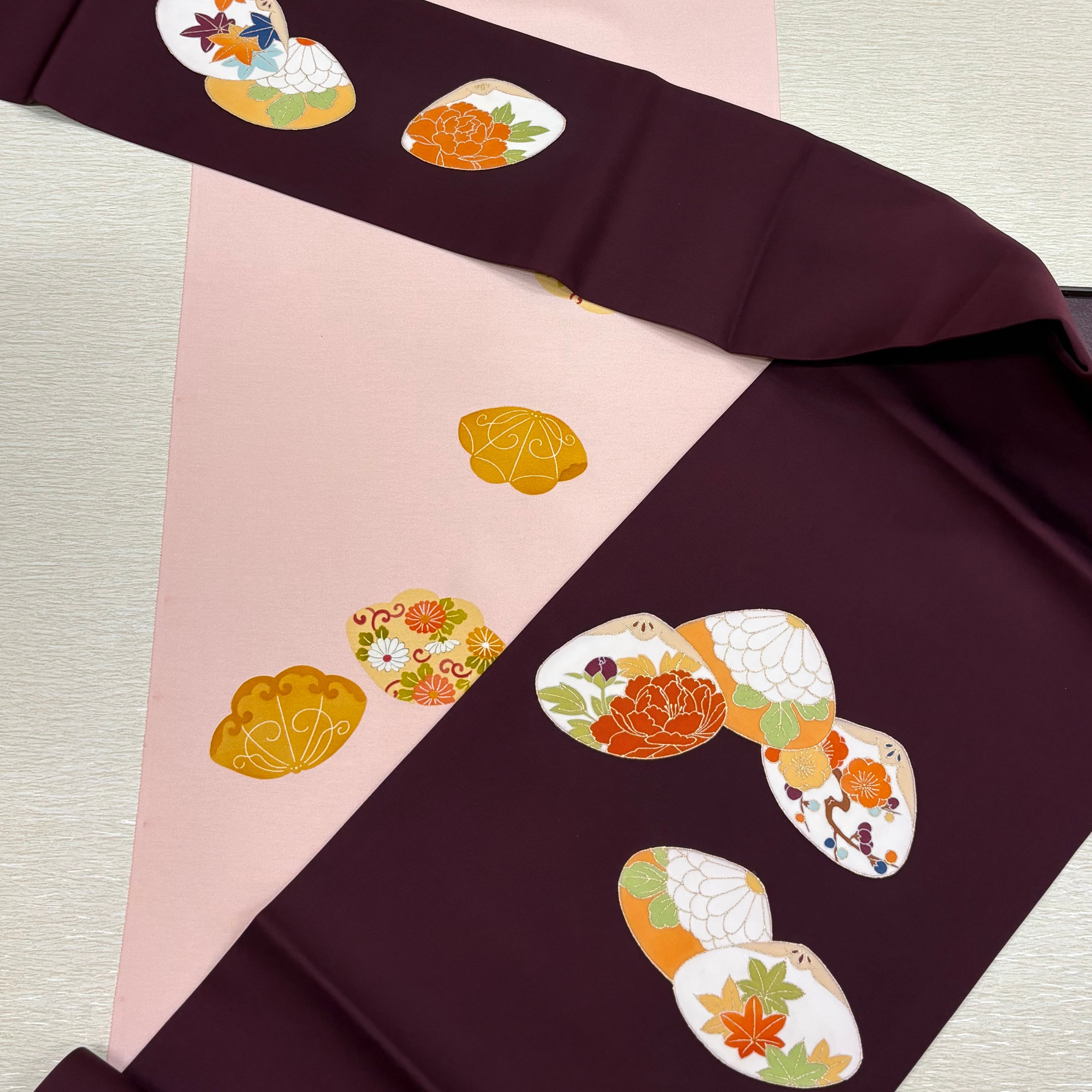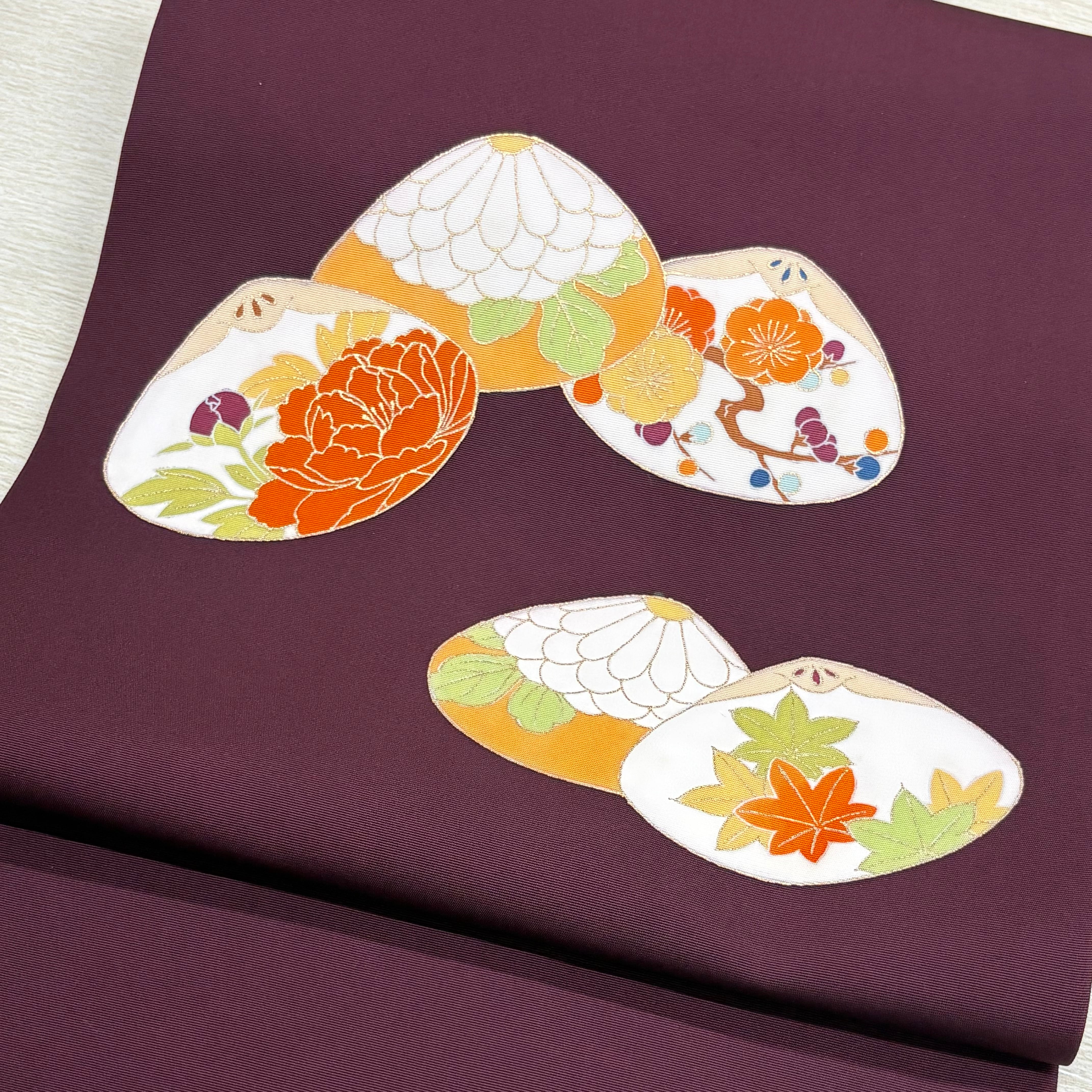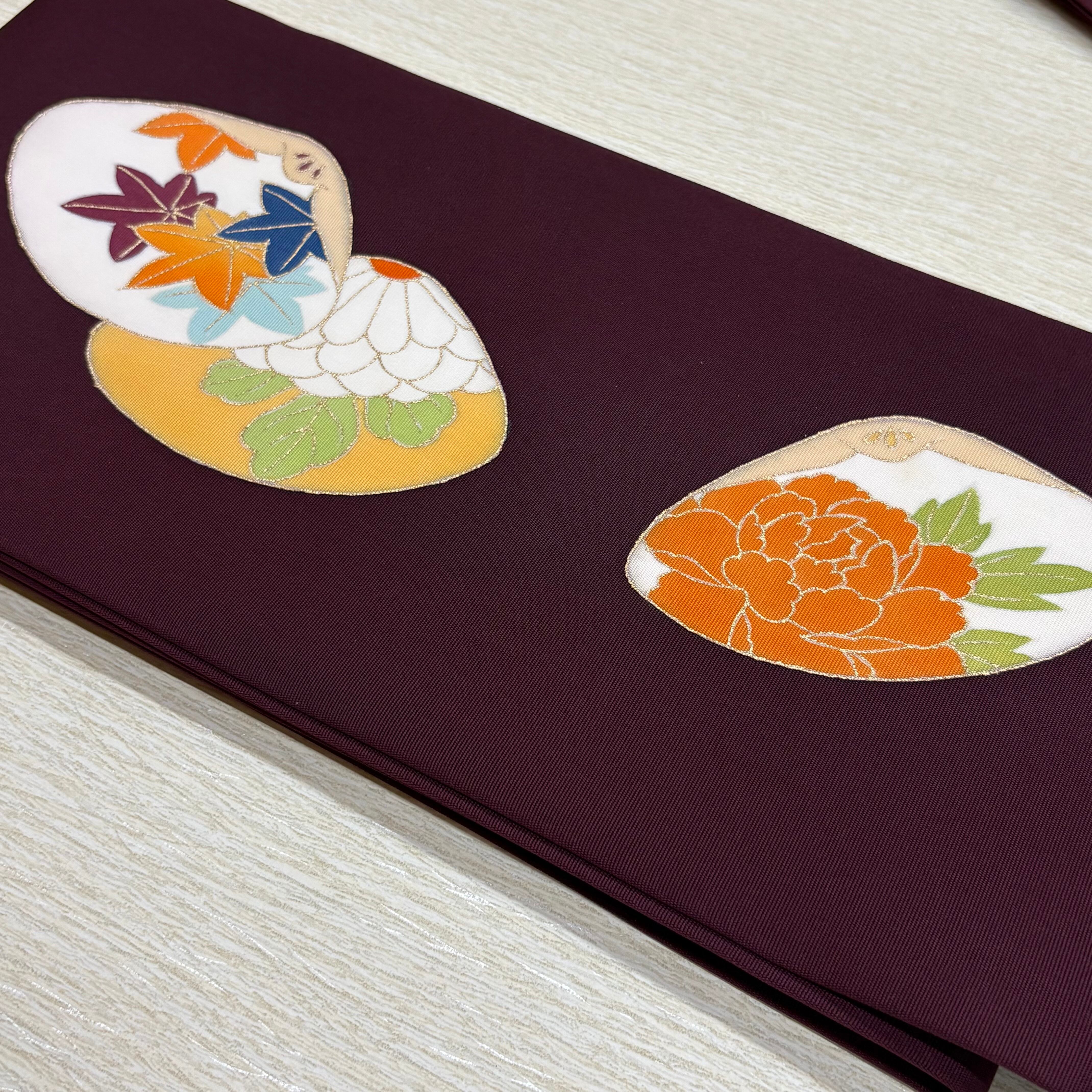 落ち着いた深みのある紫地に、愛らしく配された源氏貝の意匠が映える、塩瀬名古屋帯でございます。