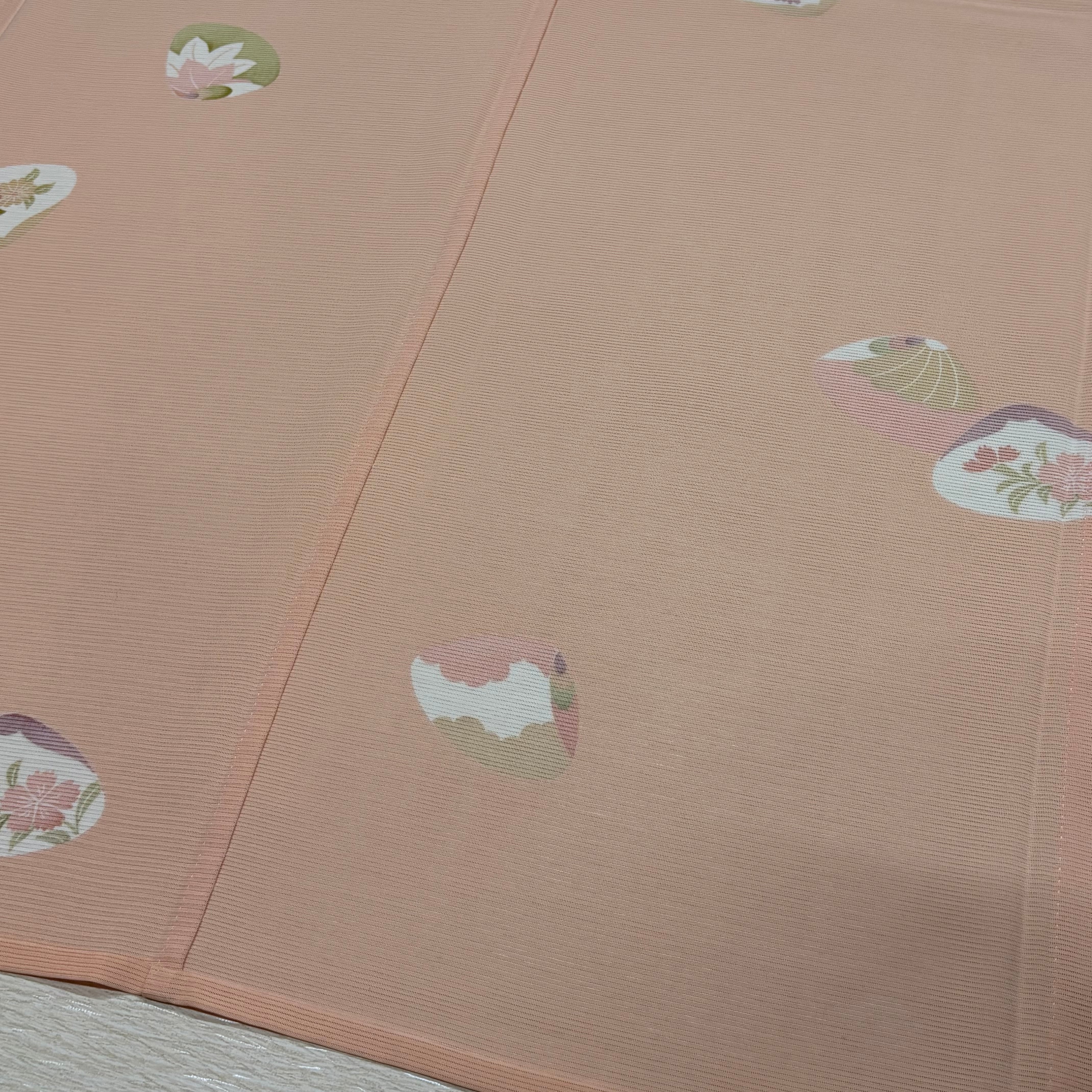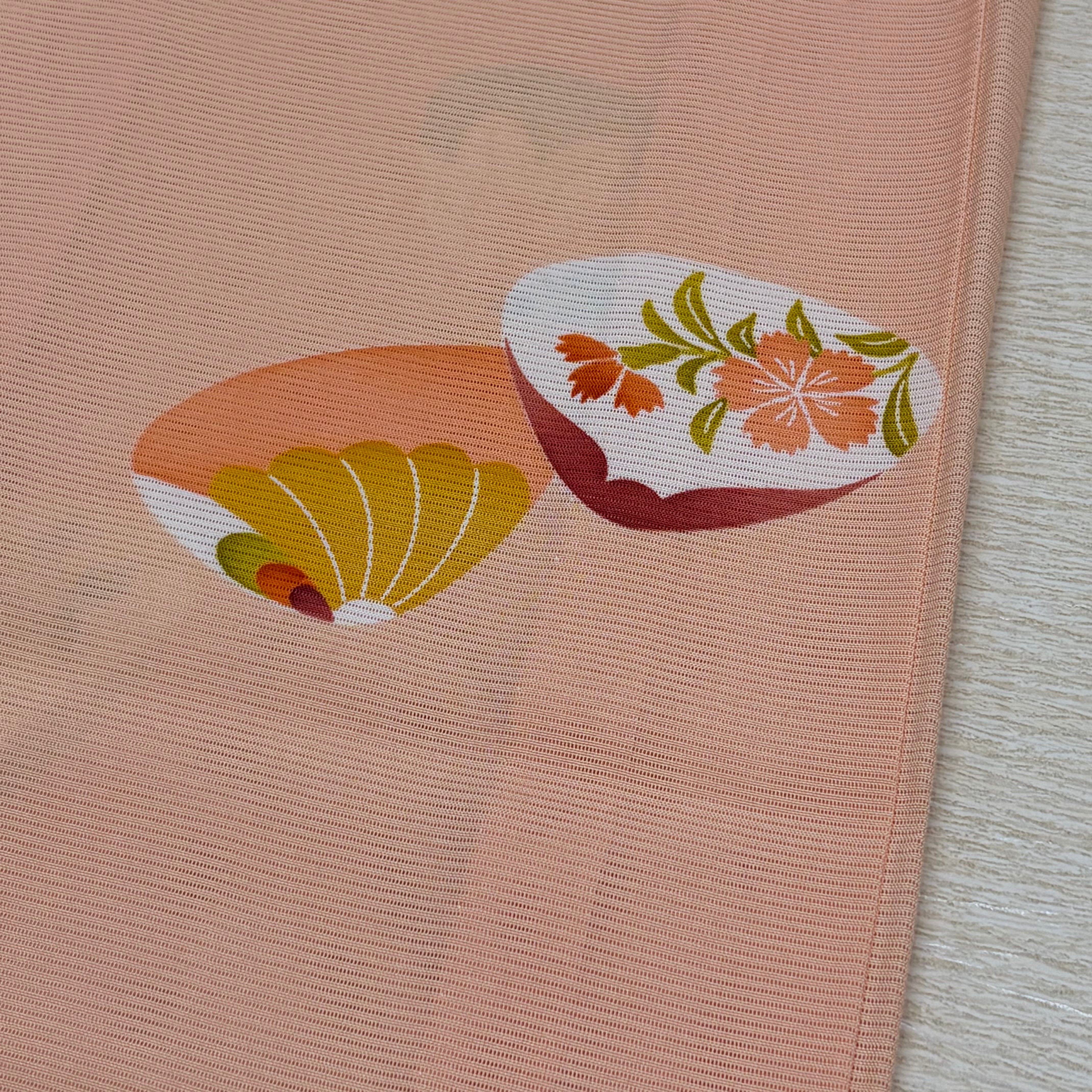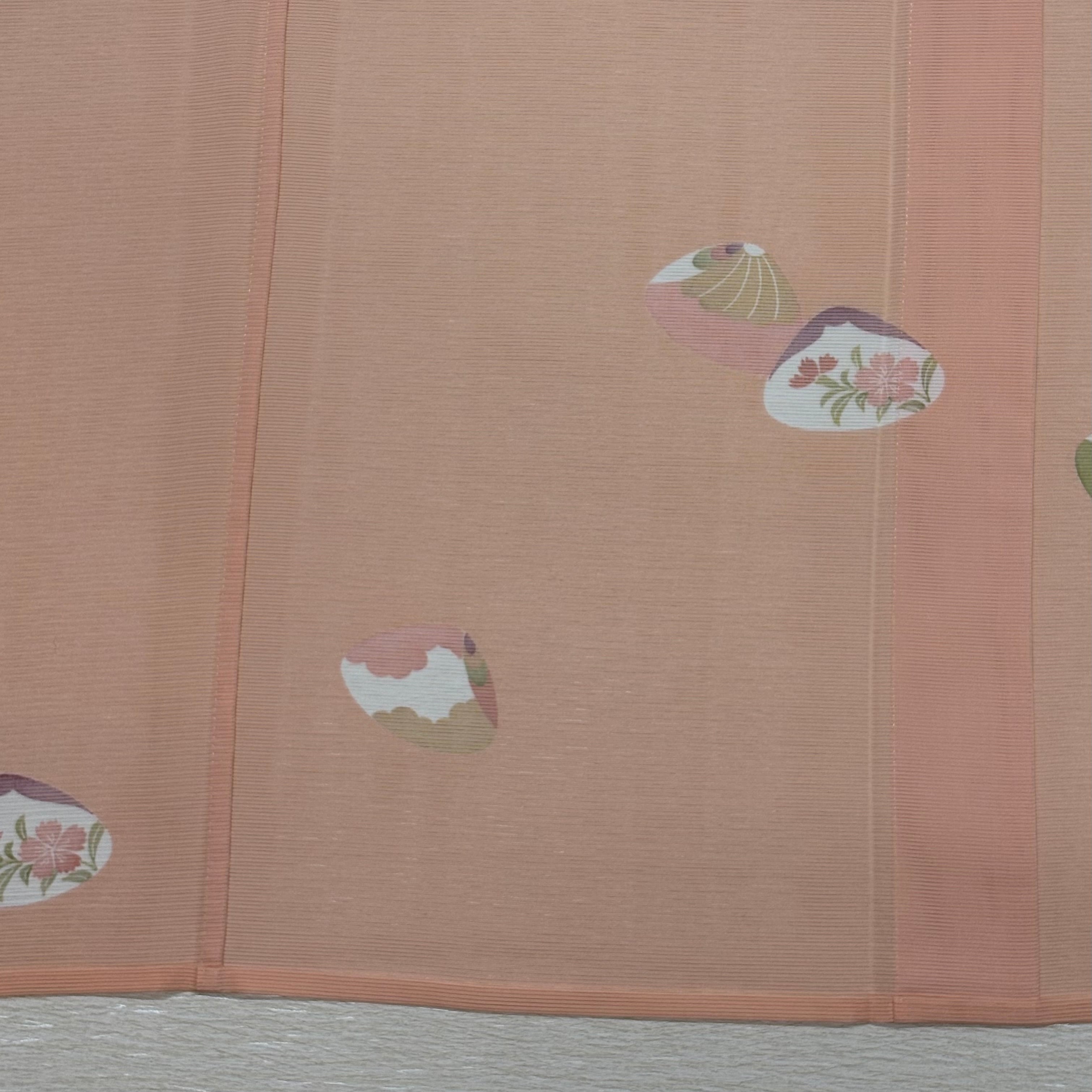 人気の源氏貝柄を、やわらかなサーモンピンクの地に上品に配した一枚です。