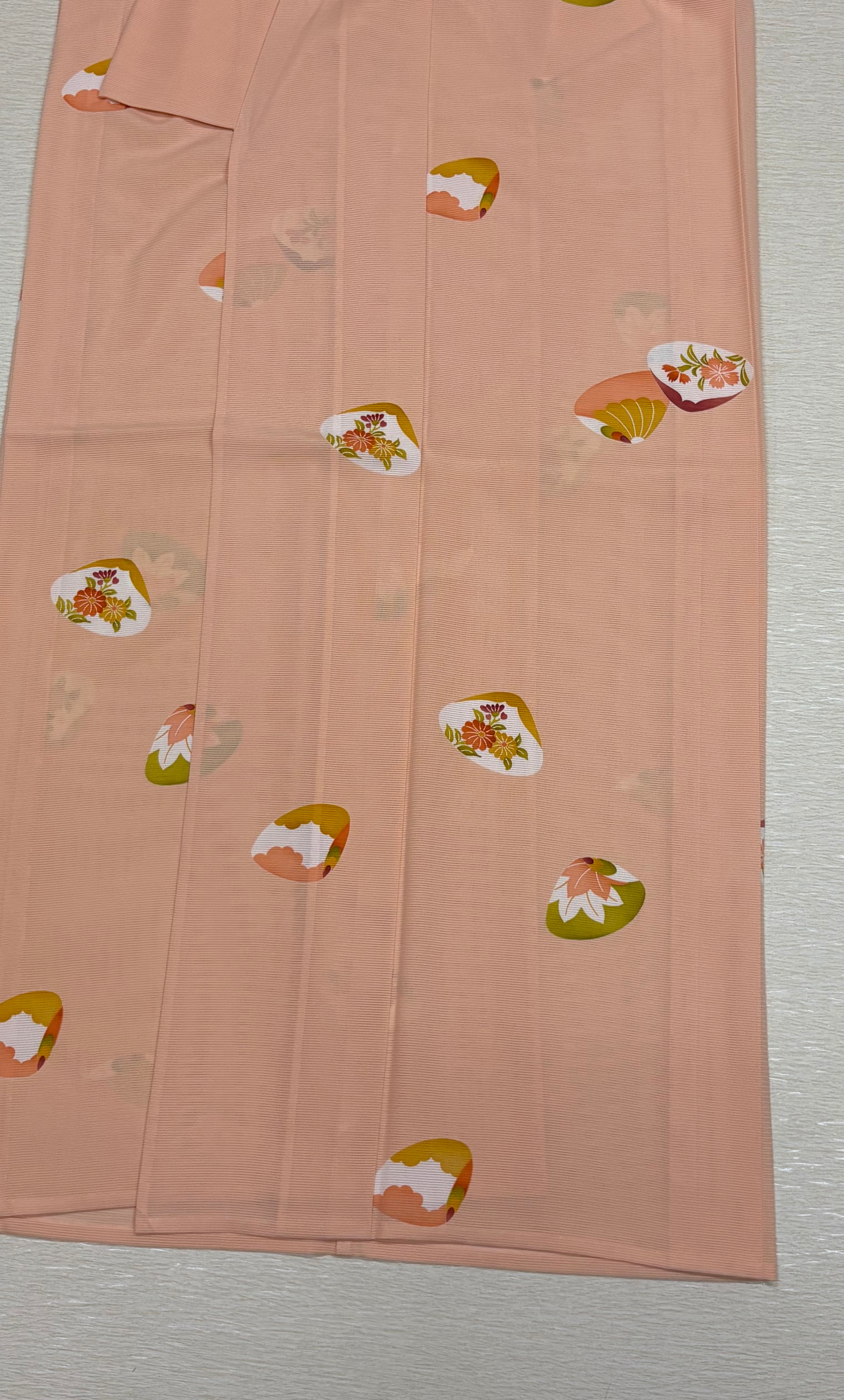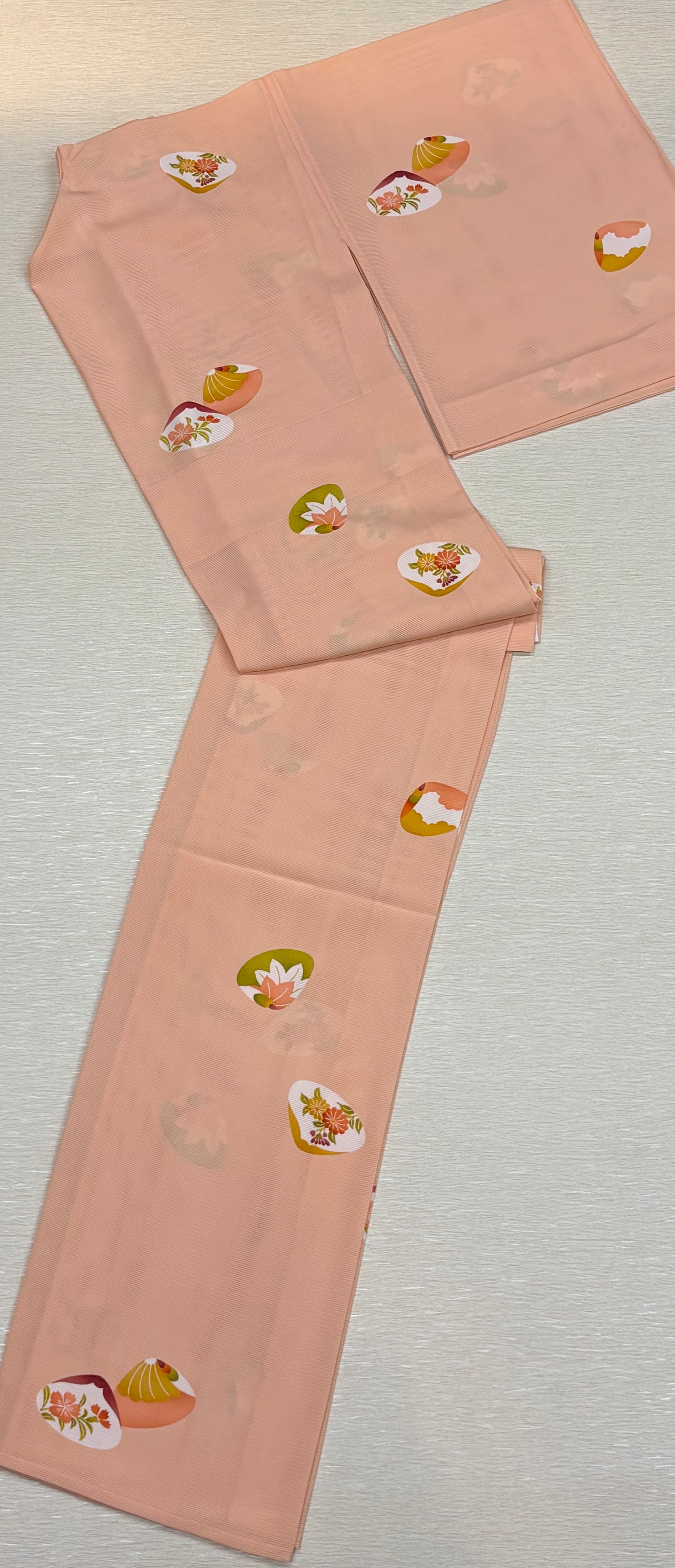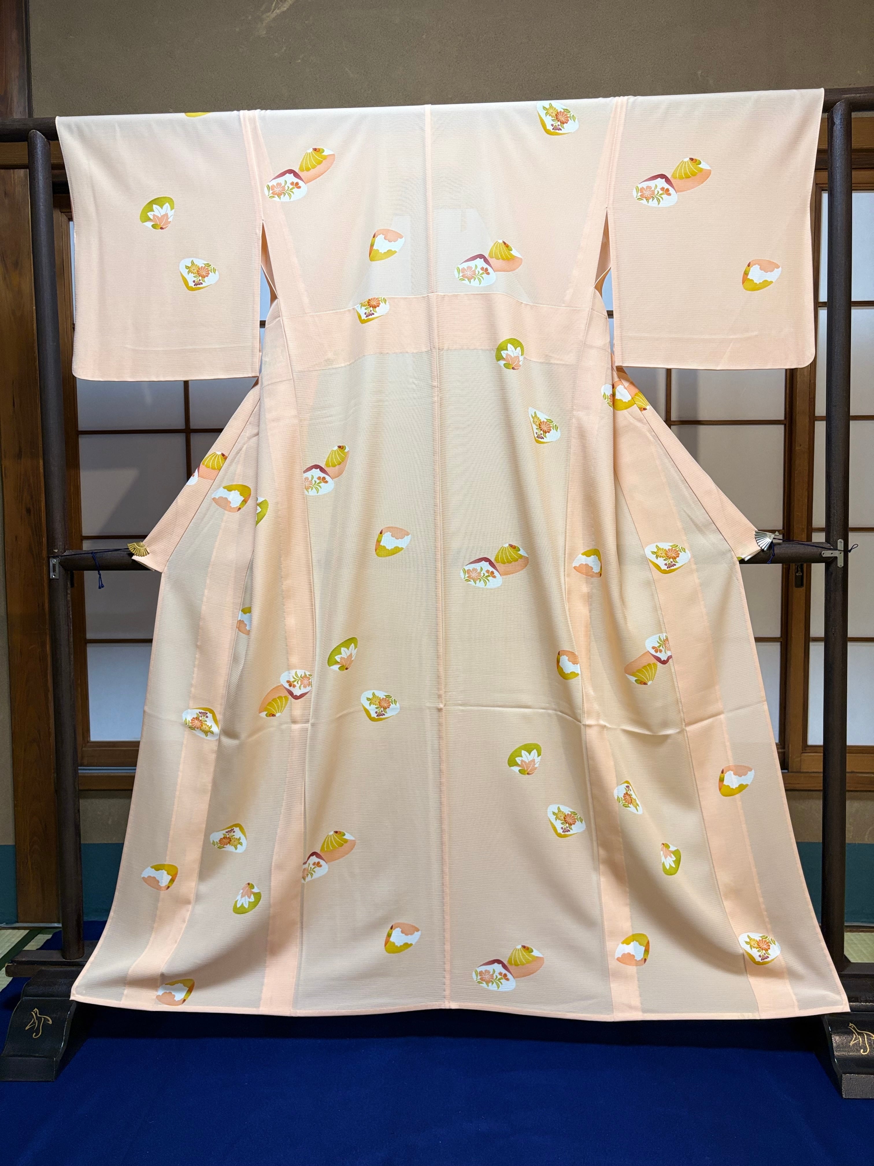 人気の源氏貝柄を、やわらかなサーモンピンクの地に上品に配した一枚です。