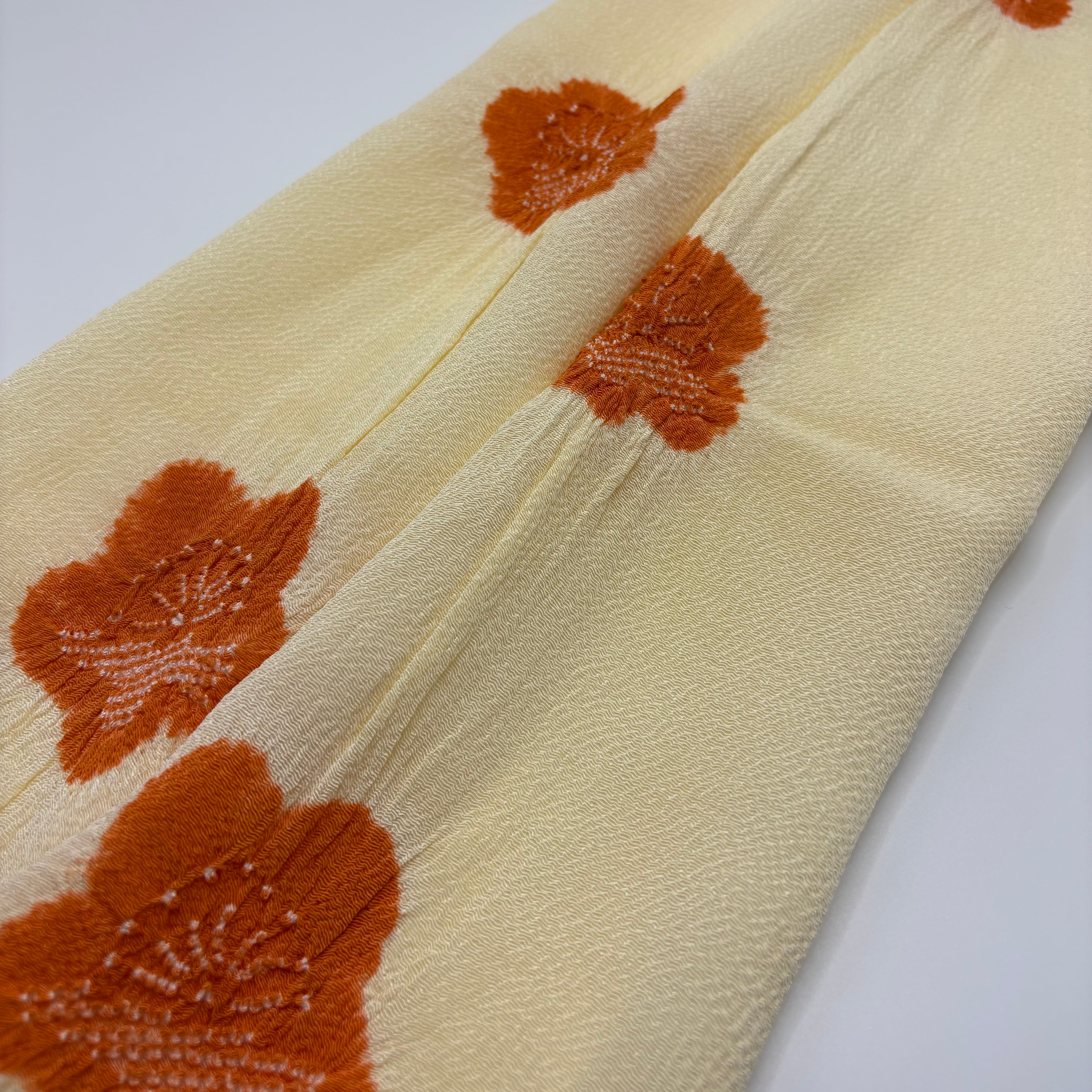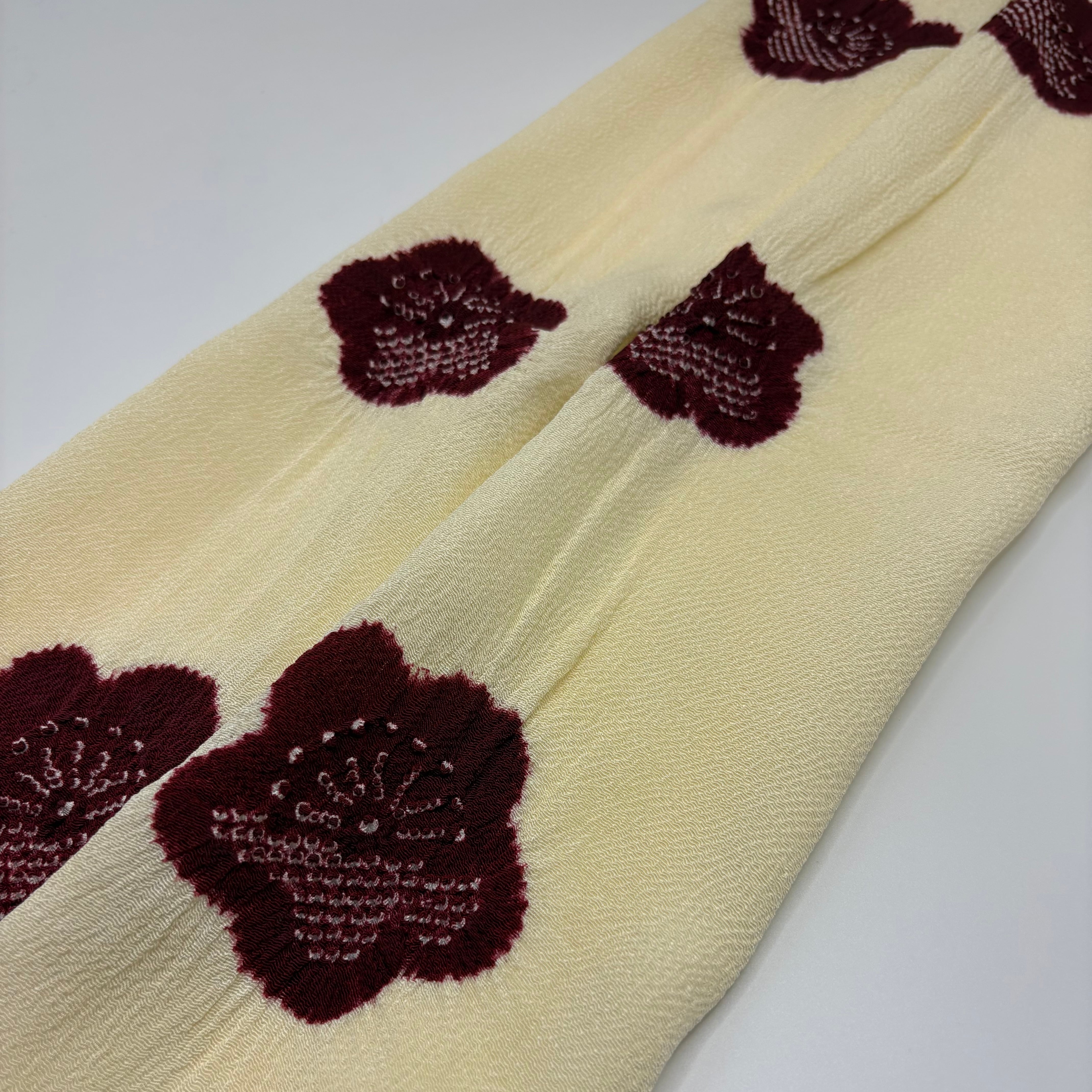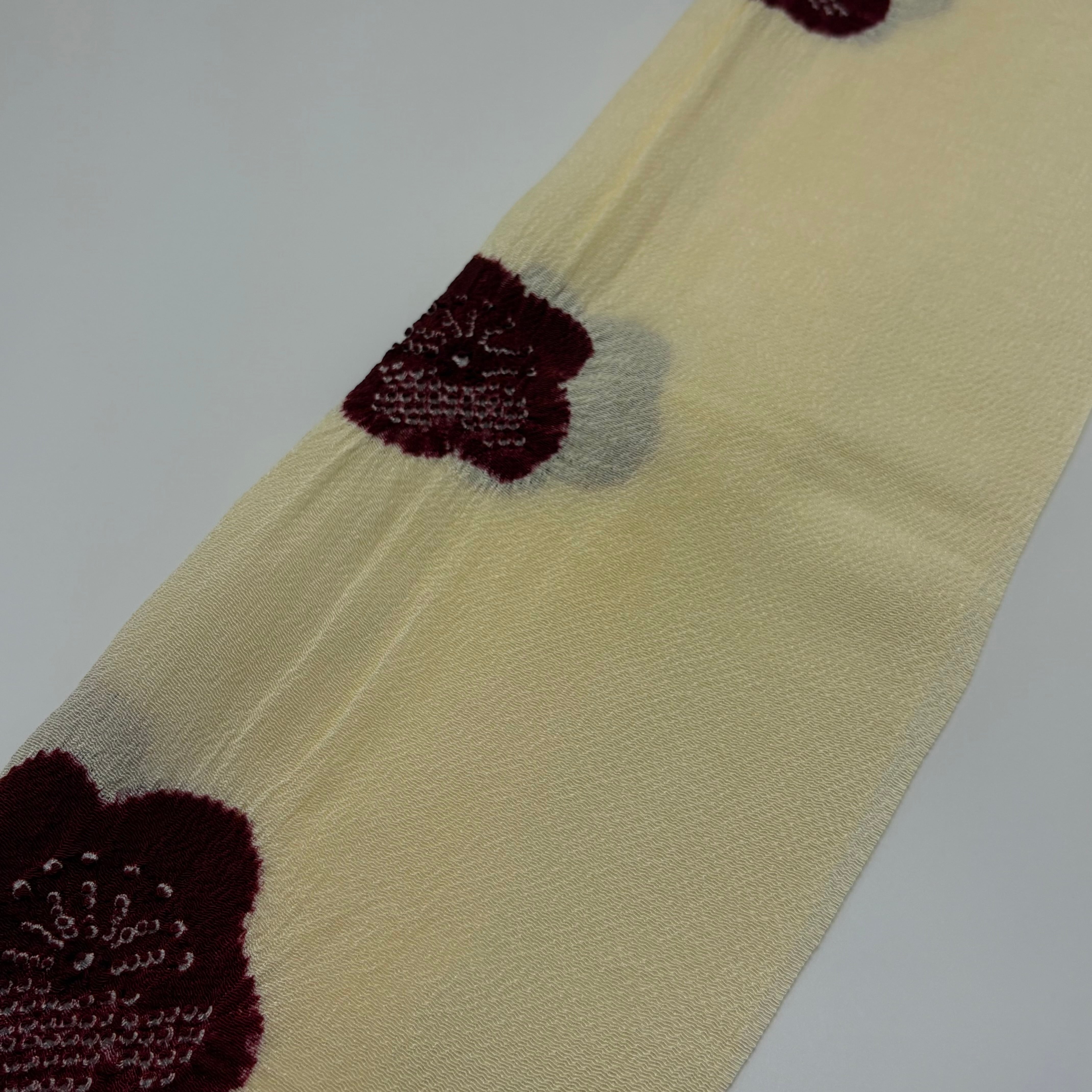 淡くやさしいクリーム色の地に、梅の花を絞りで散らした、上品で愛らしい帯揚げです。
