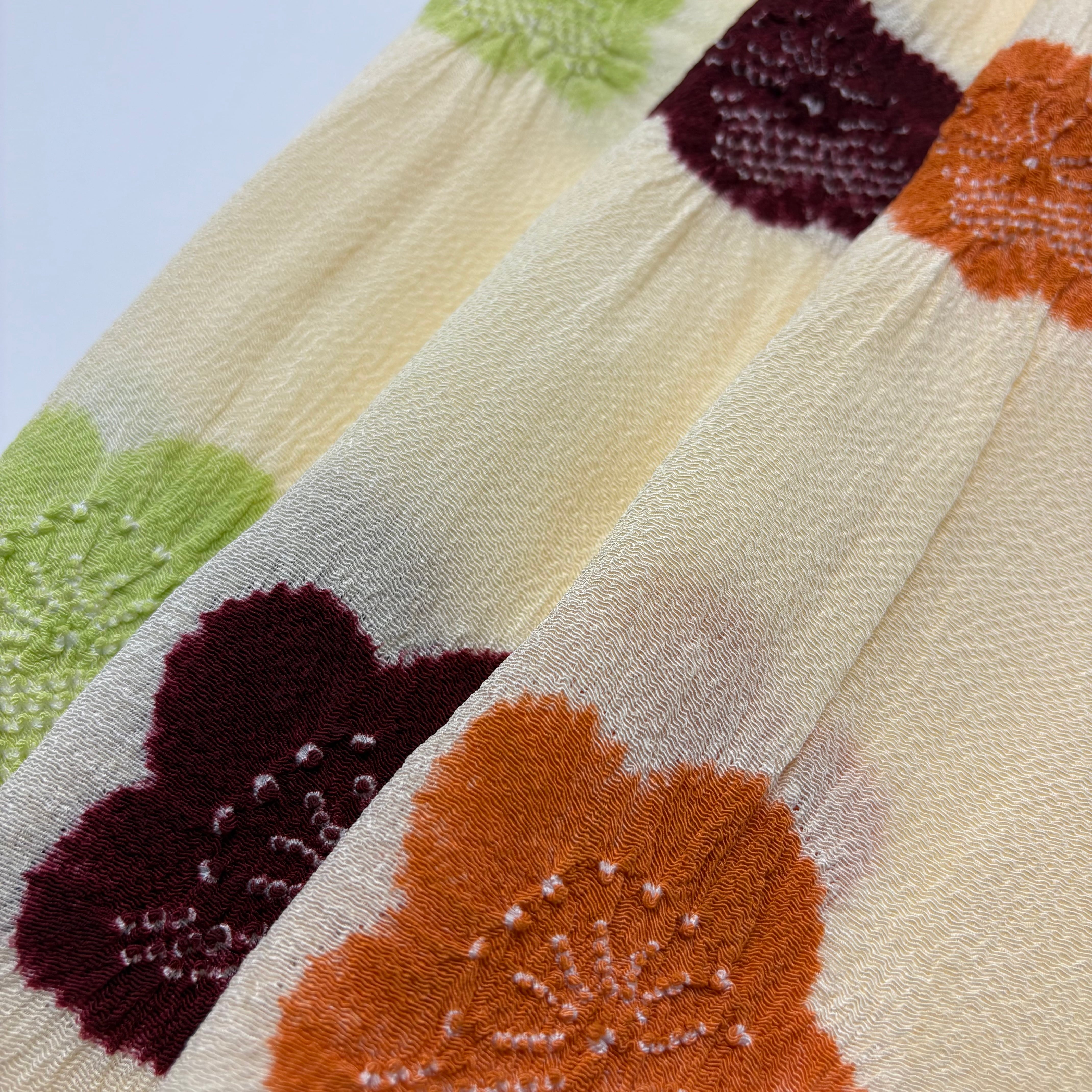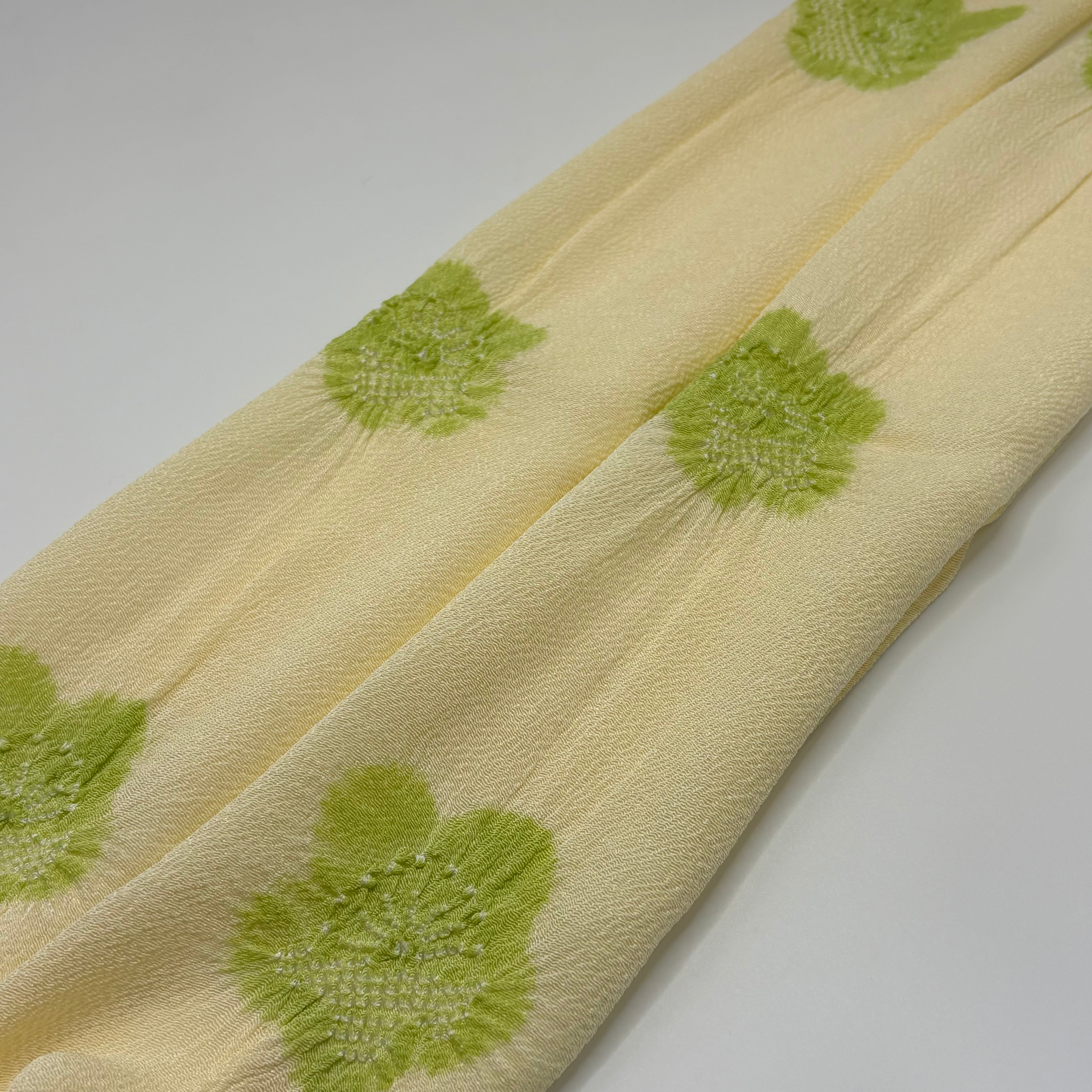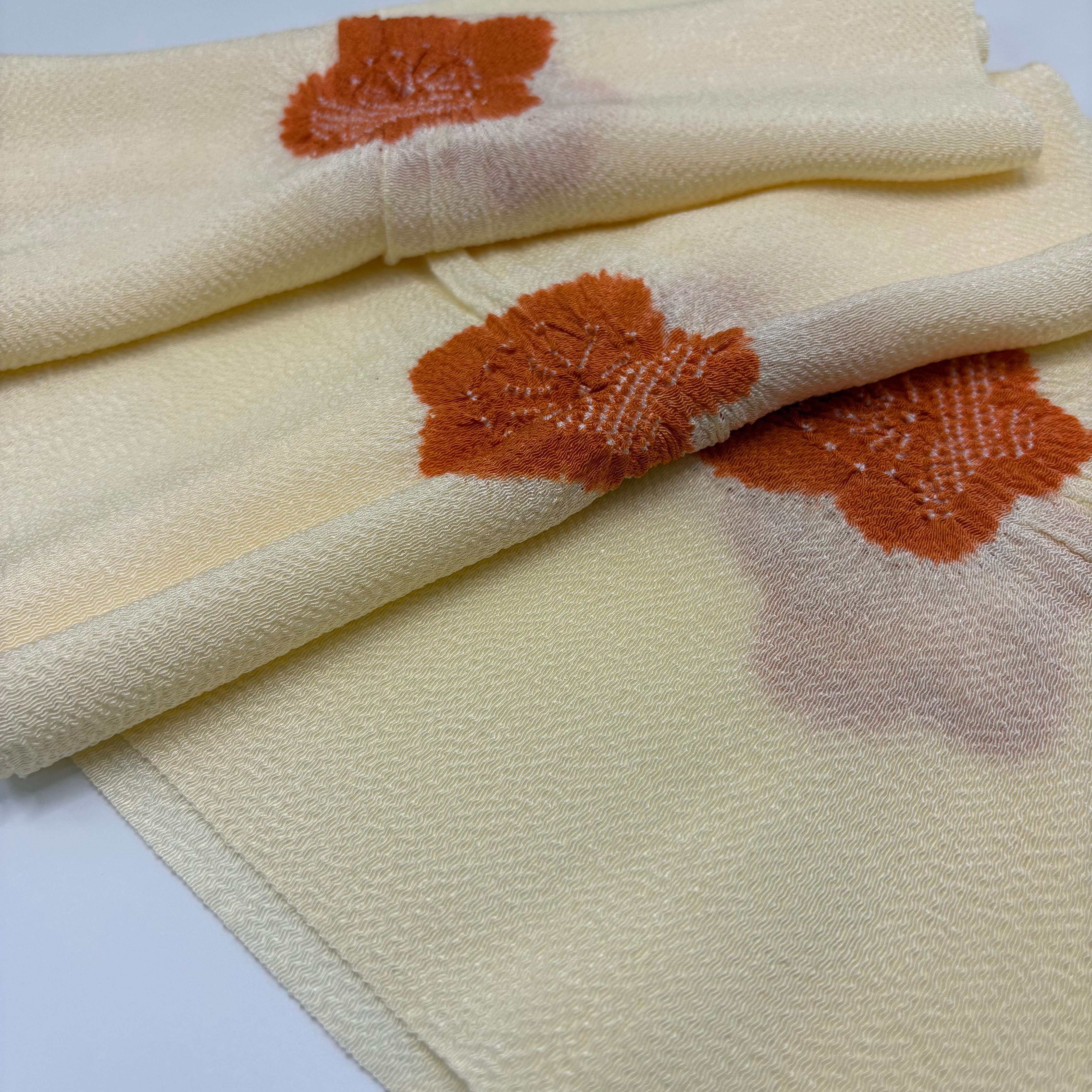 淡くやさしいクリーム色の地に、梅の花を絞りで散らした、上品で愛らしい帯揚げです。